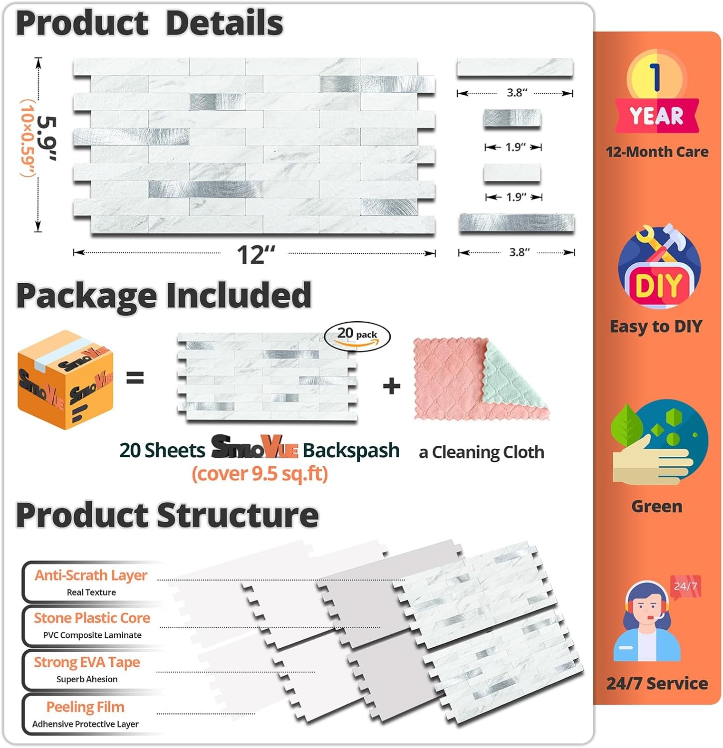 20 Sheets Peel and Stick Backsplash for Kitchen, White Marble with Metal Silver