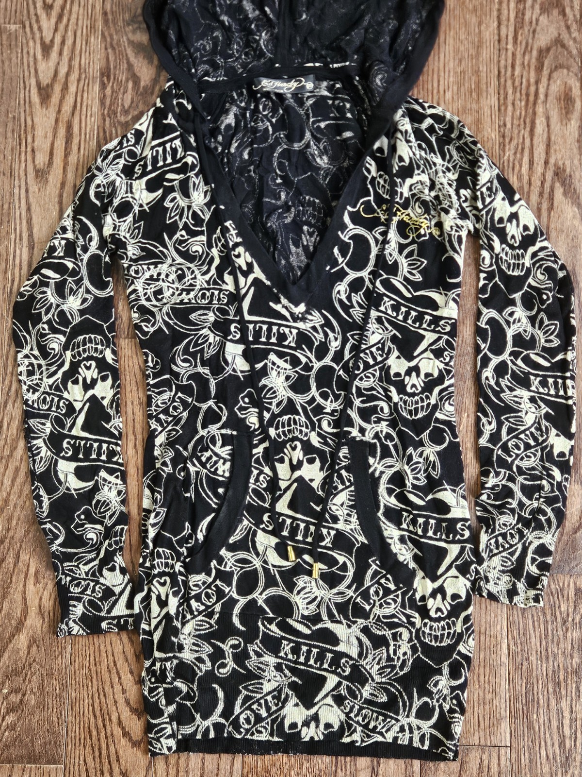 y2k vintage ed hardy love kills slowly rhinestone hoodie womens XS tiger Stretch