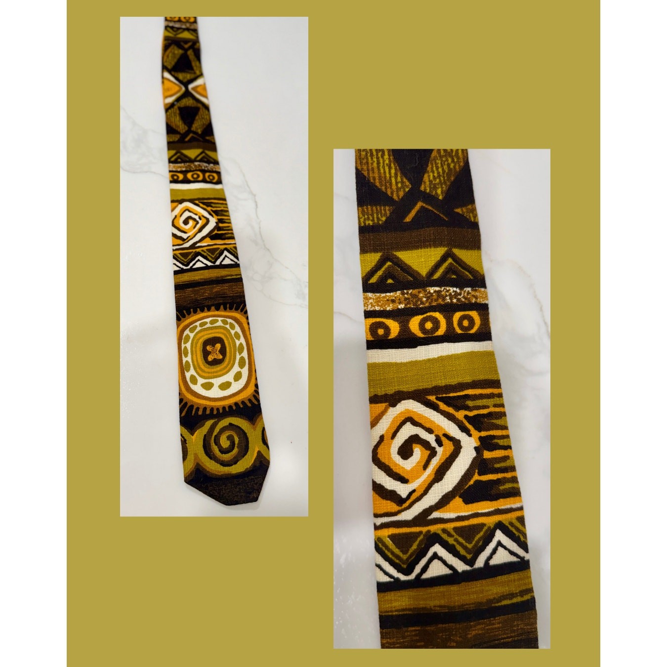 как выглядит Vintage 60s TiKiTie Batik Tiki Print Gold Brown Black Cotton Made in Hawaii Tie фото