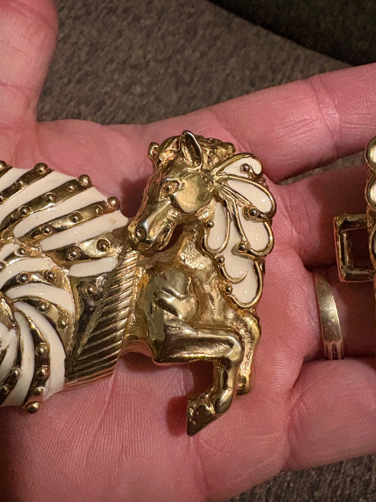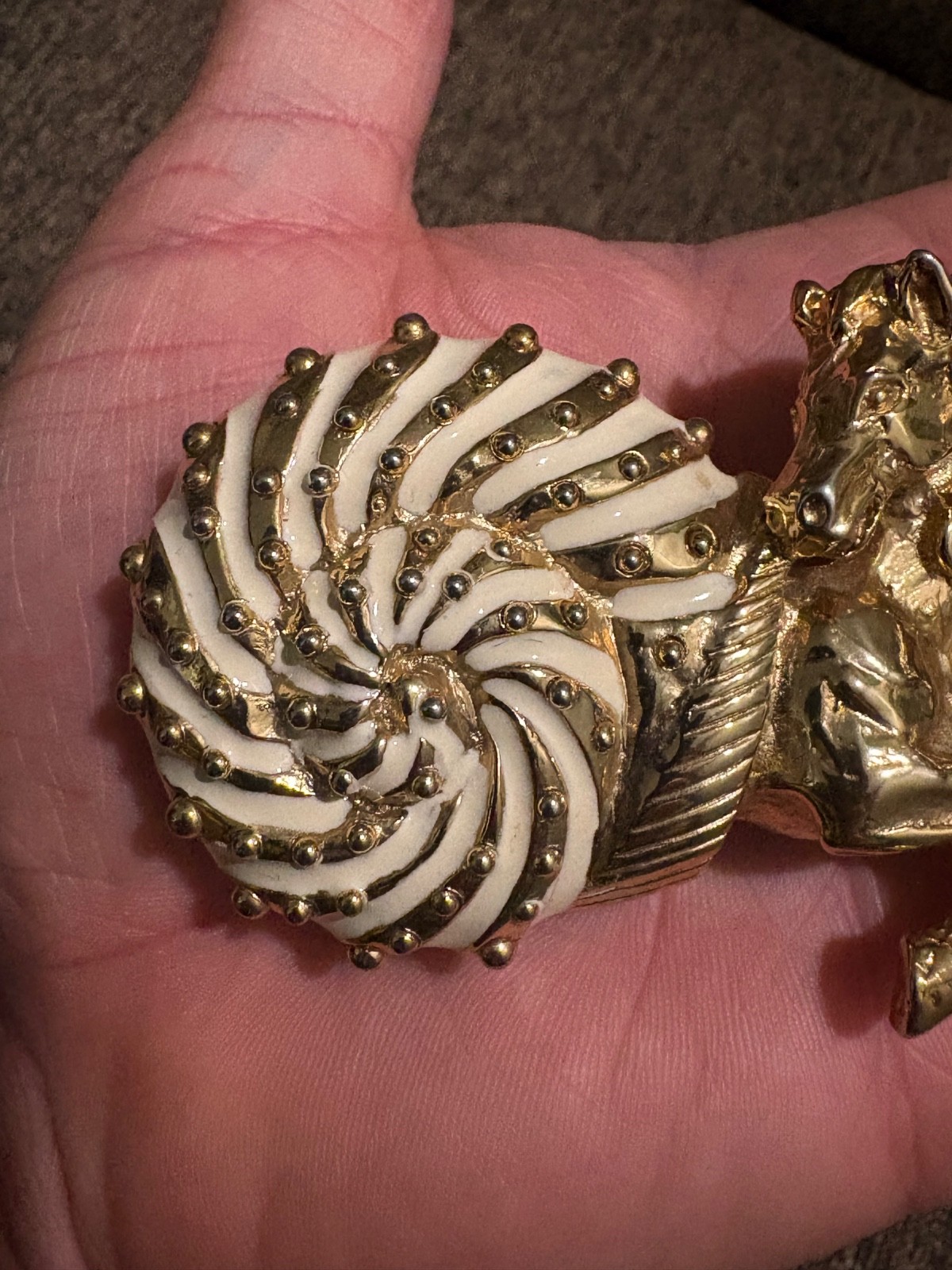 как выглядит SUPER RARE Vintage MIMI DI N Unusual Horse Shell Belt Buckle Enamel Gold Tone фото