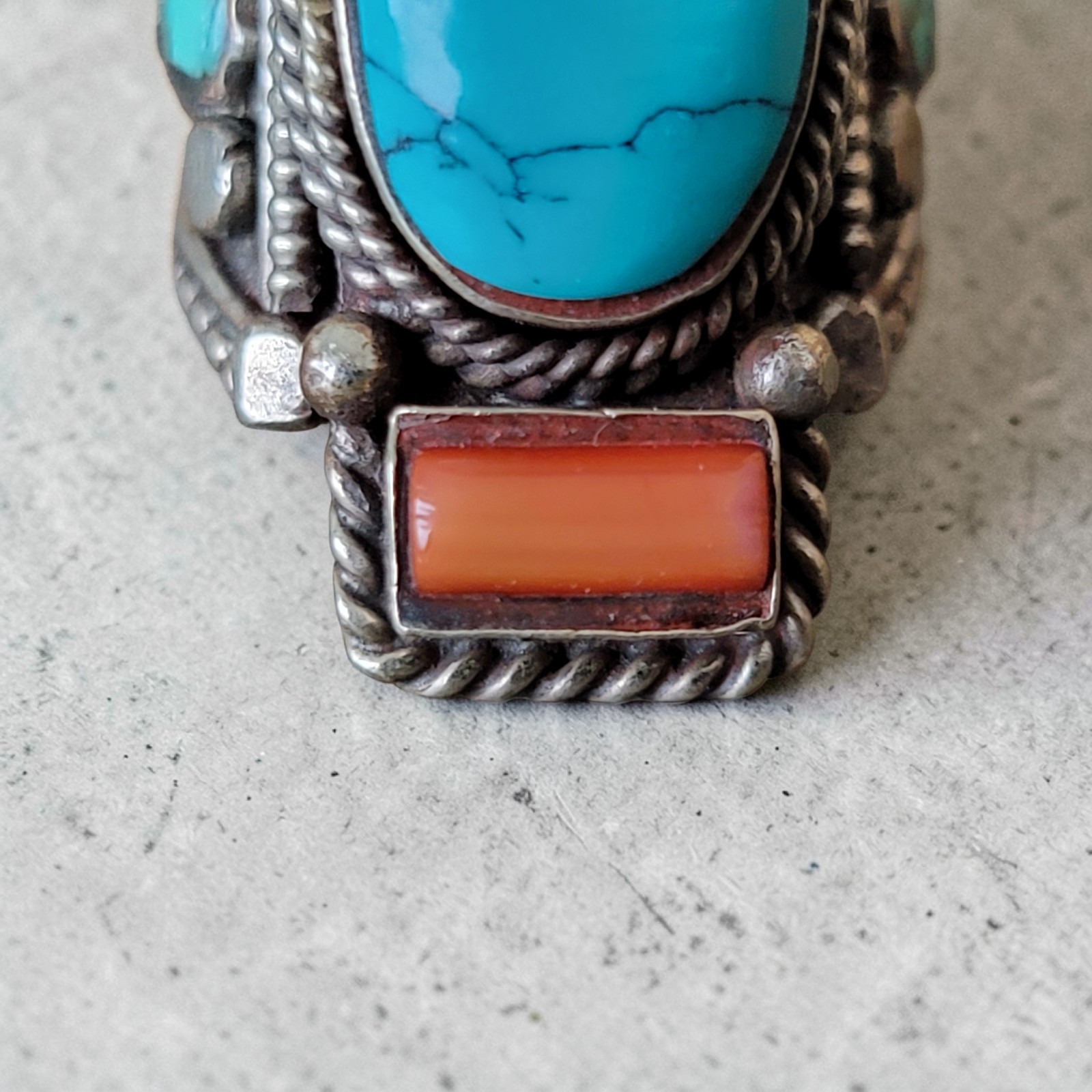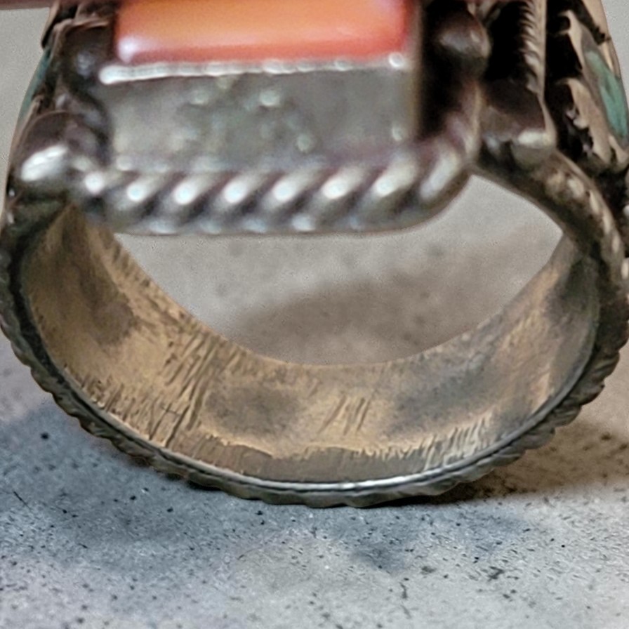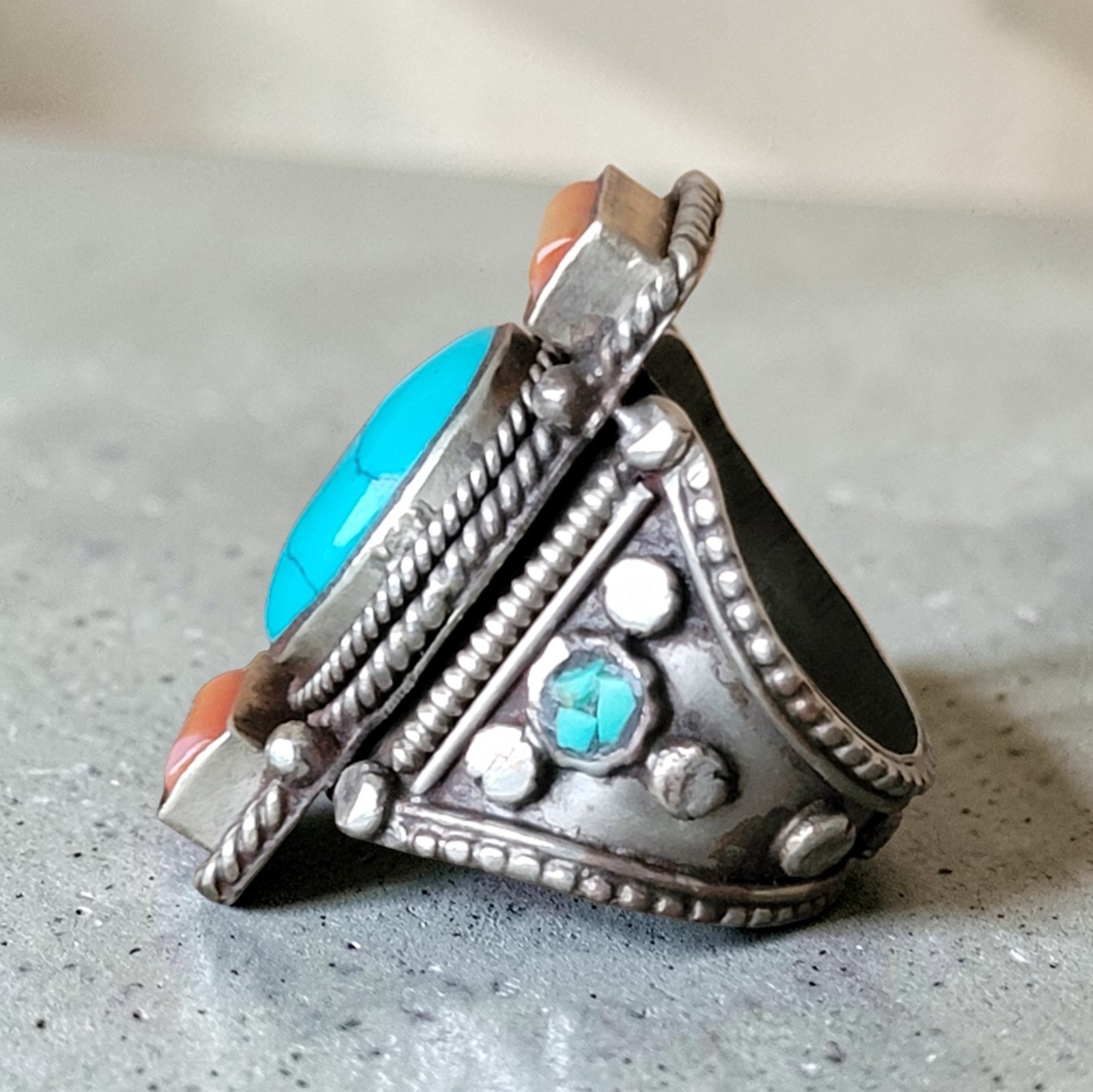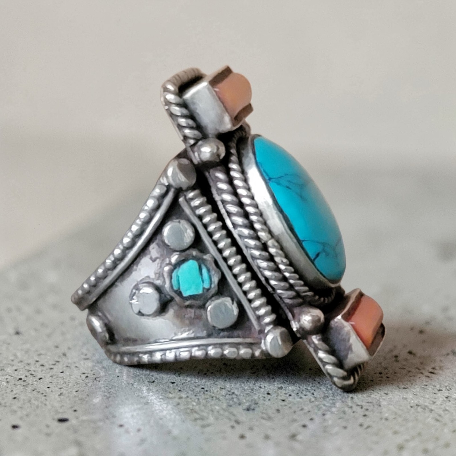 как выглядит Vintage Tibetan Turquoise Ring Red Coral Inlay Size 10 Retro Boho Indie фото