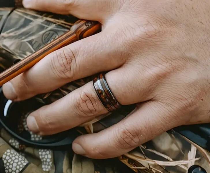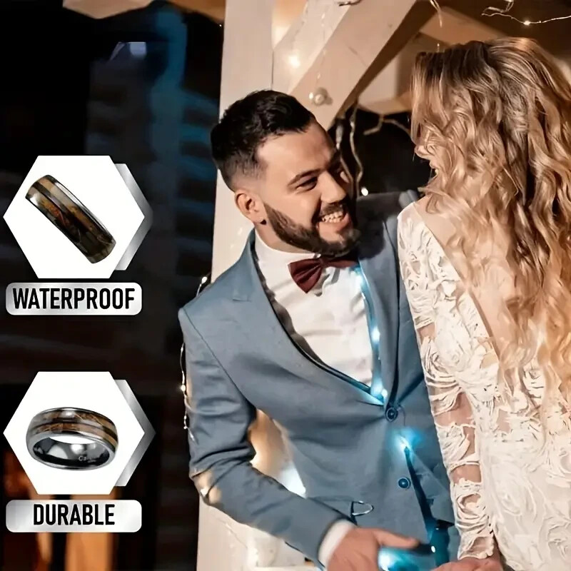 Особенности: Nickel-Free, Steel Ring with Wood Grain Inlay, Whiskey Barrel Ideal for Wedding or Engagement, Can Be Engraved Easily
