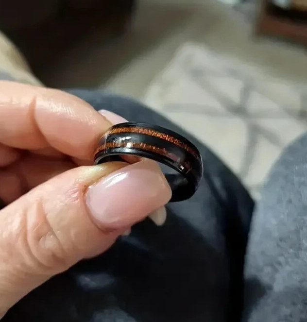 как выглядит 8mm Size 7 - Whiskey Barrel Wood Inlay Wedding Band - Stainless Ring Brand New фото