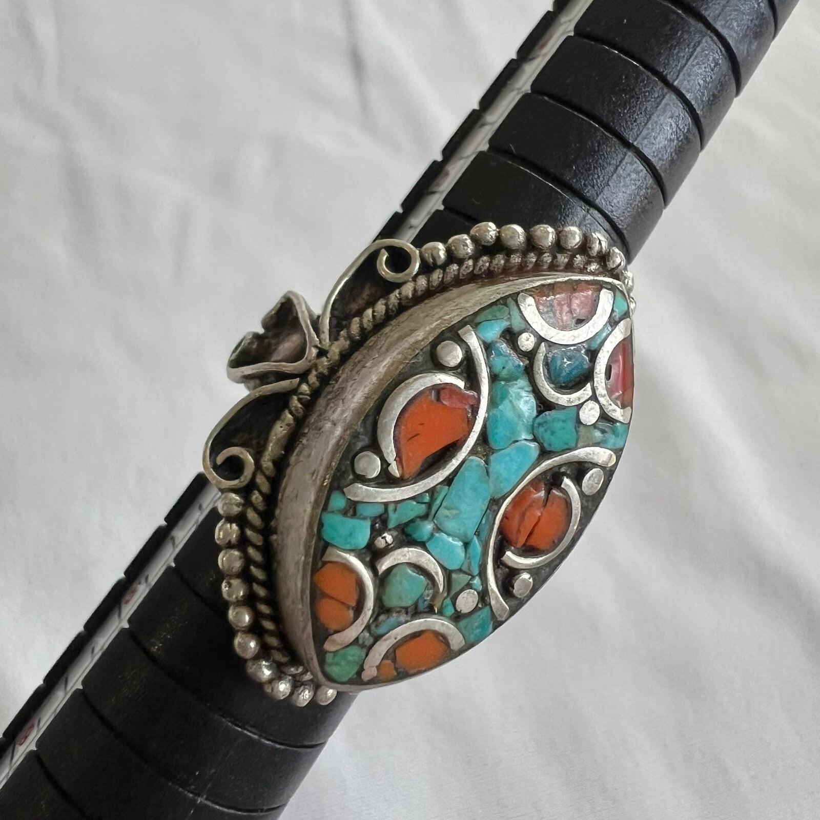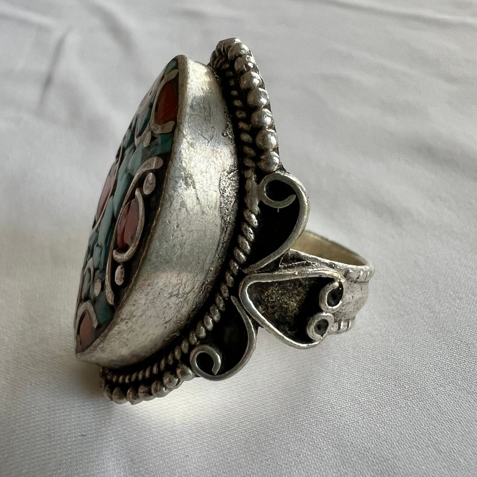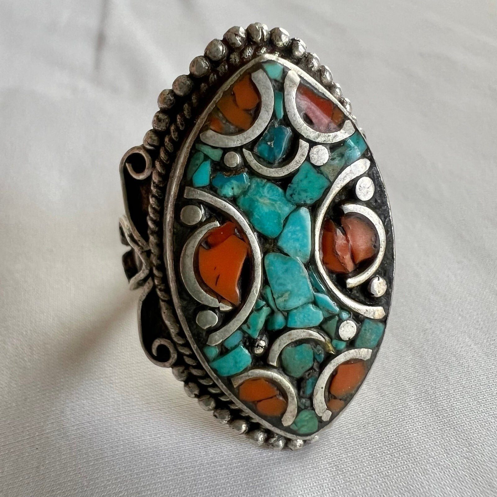 Turquoise Coral Inlay Tibetan Silver Handmade Artisan Chunky Statement Ring