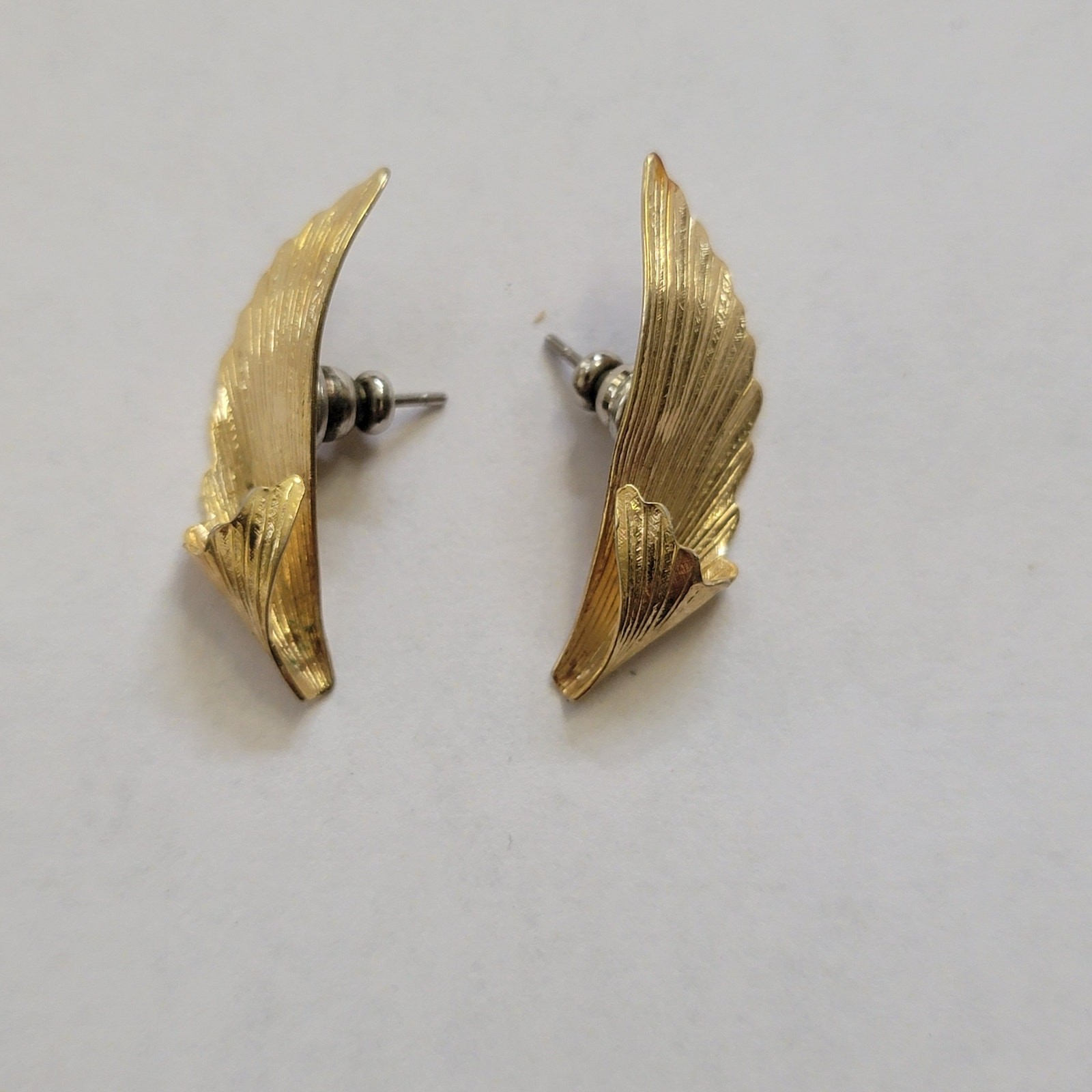 как выглядит Vintage Gold Tone Feather Wing Stud Earrings Textured Leaf Curved Post Back Pair фото
