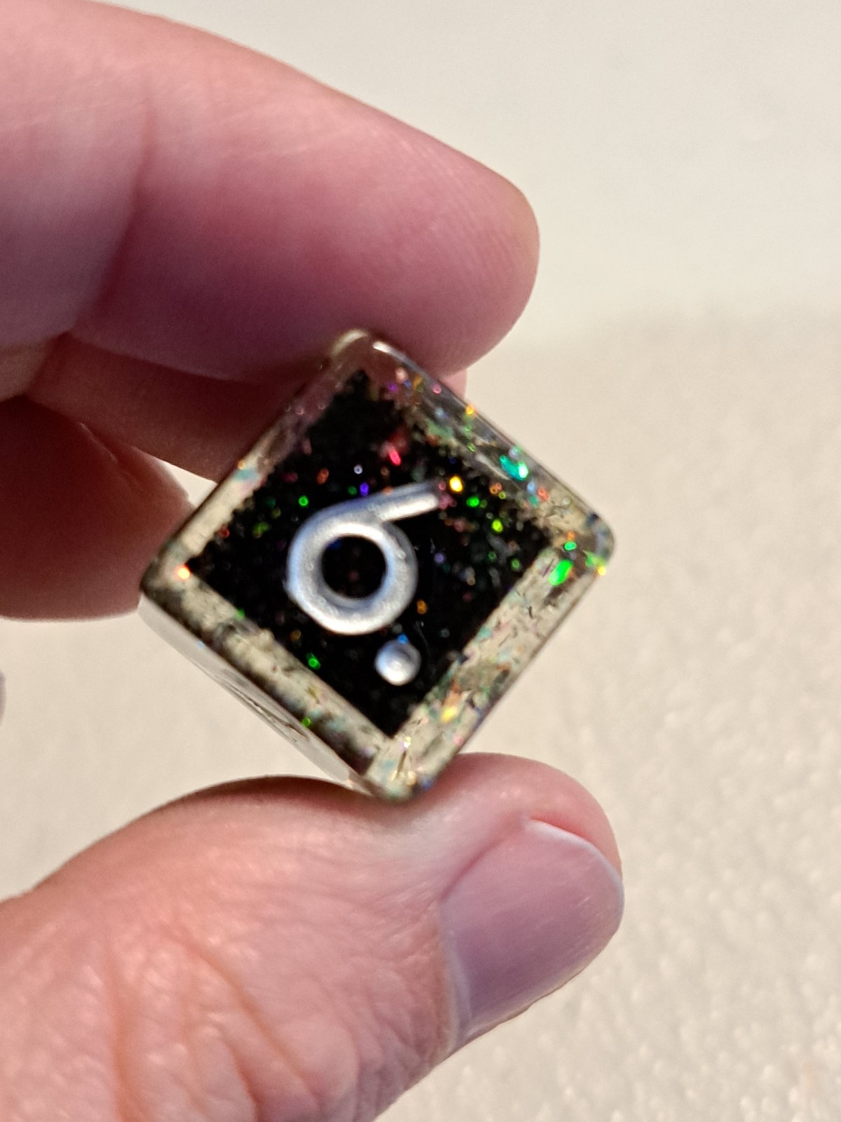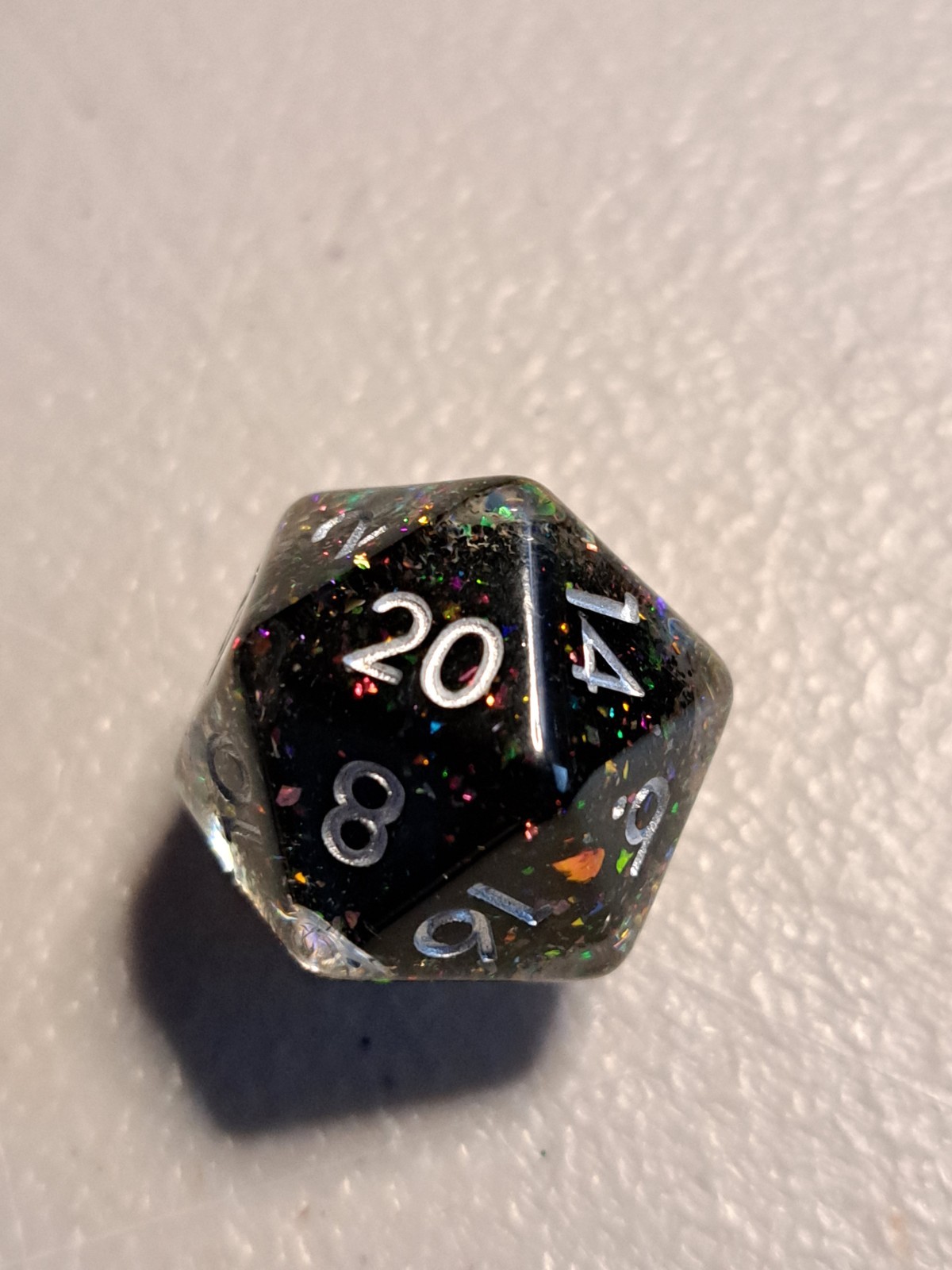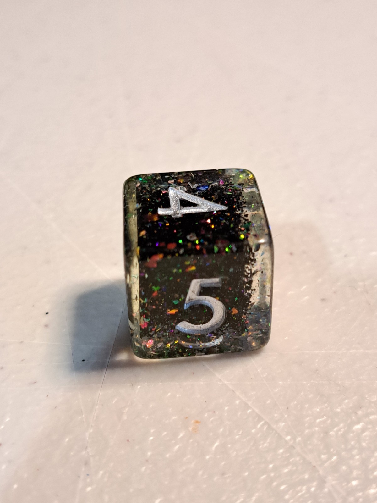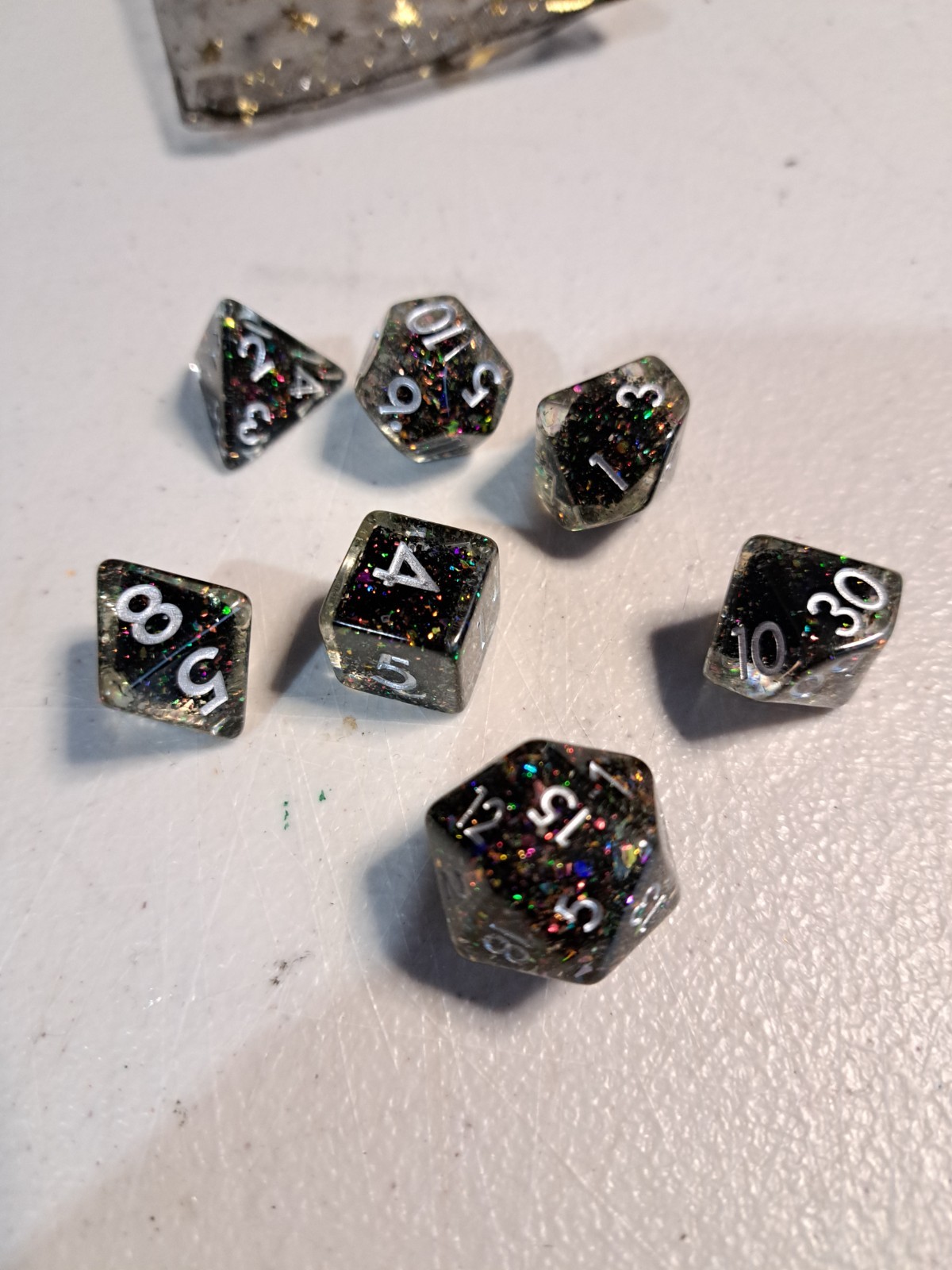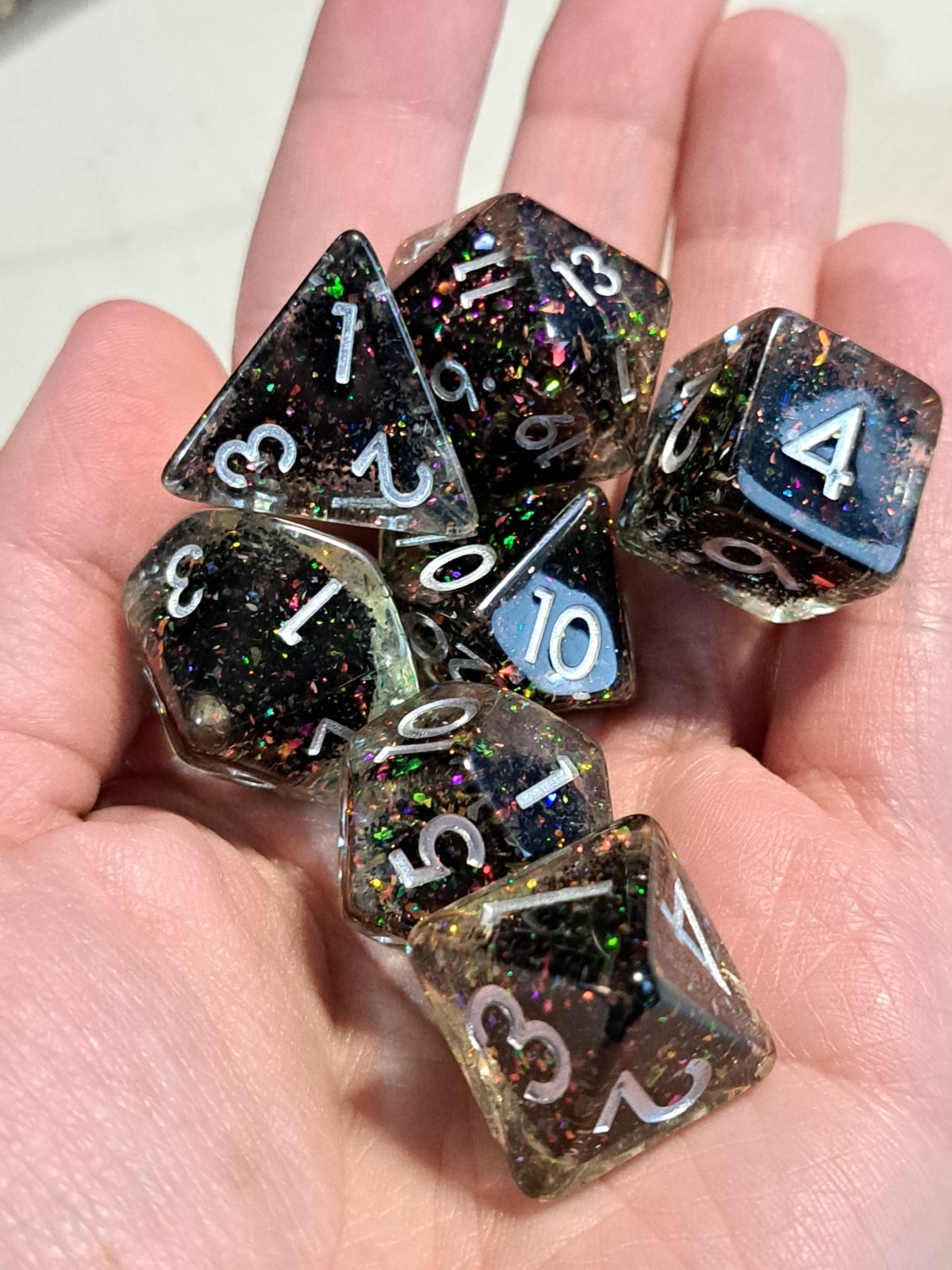 7 Peice Acrylic Dice. Clear Glitering Black with Whit Numbers