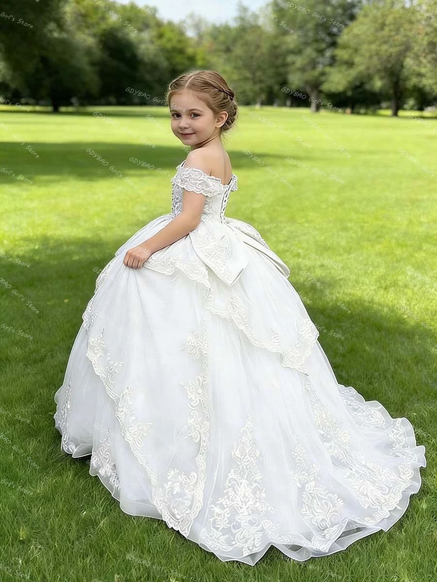 Drop Shoulder Flower Girl Dress for Wedding Kids Appliques Tiered Tulle Princess