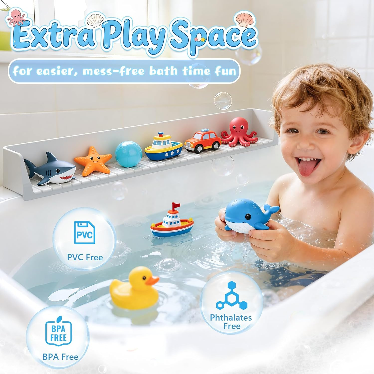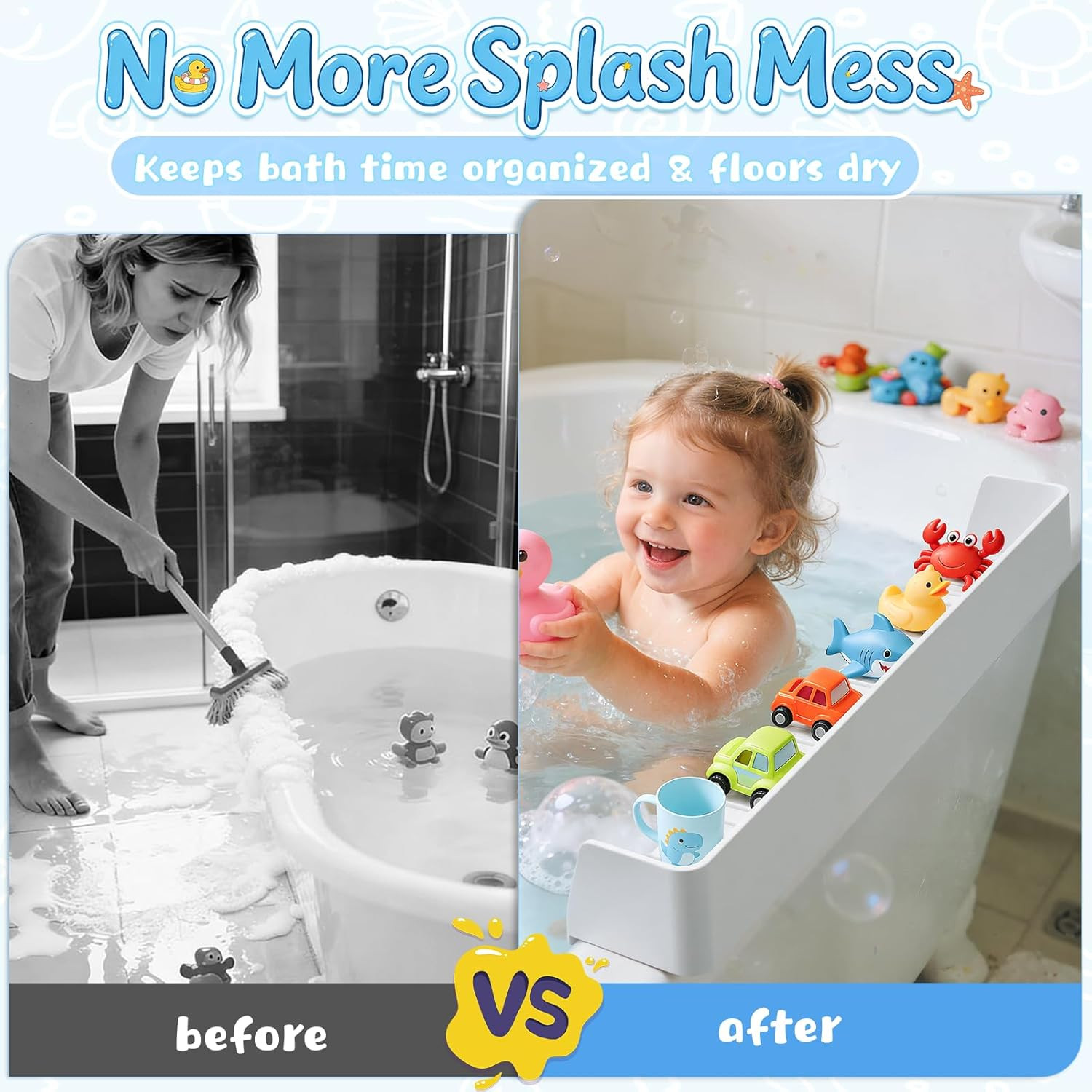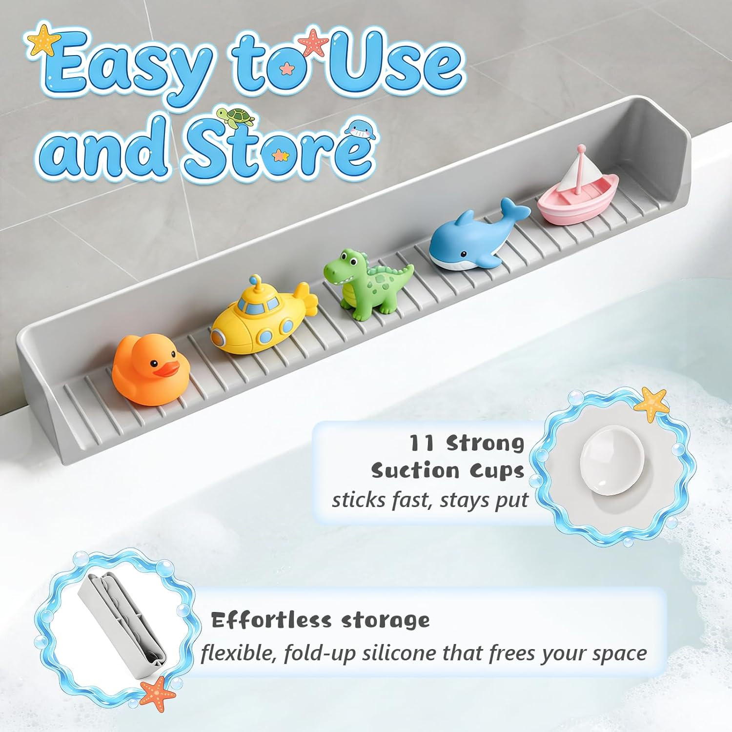 Silicone Bathtub Splash Guard with Suction Cups and Toy Storage Shelf, Grey