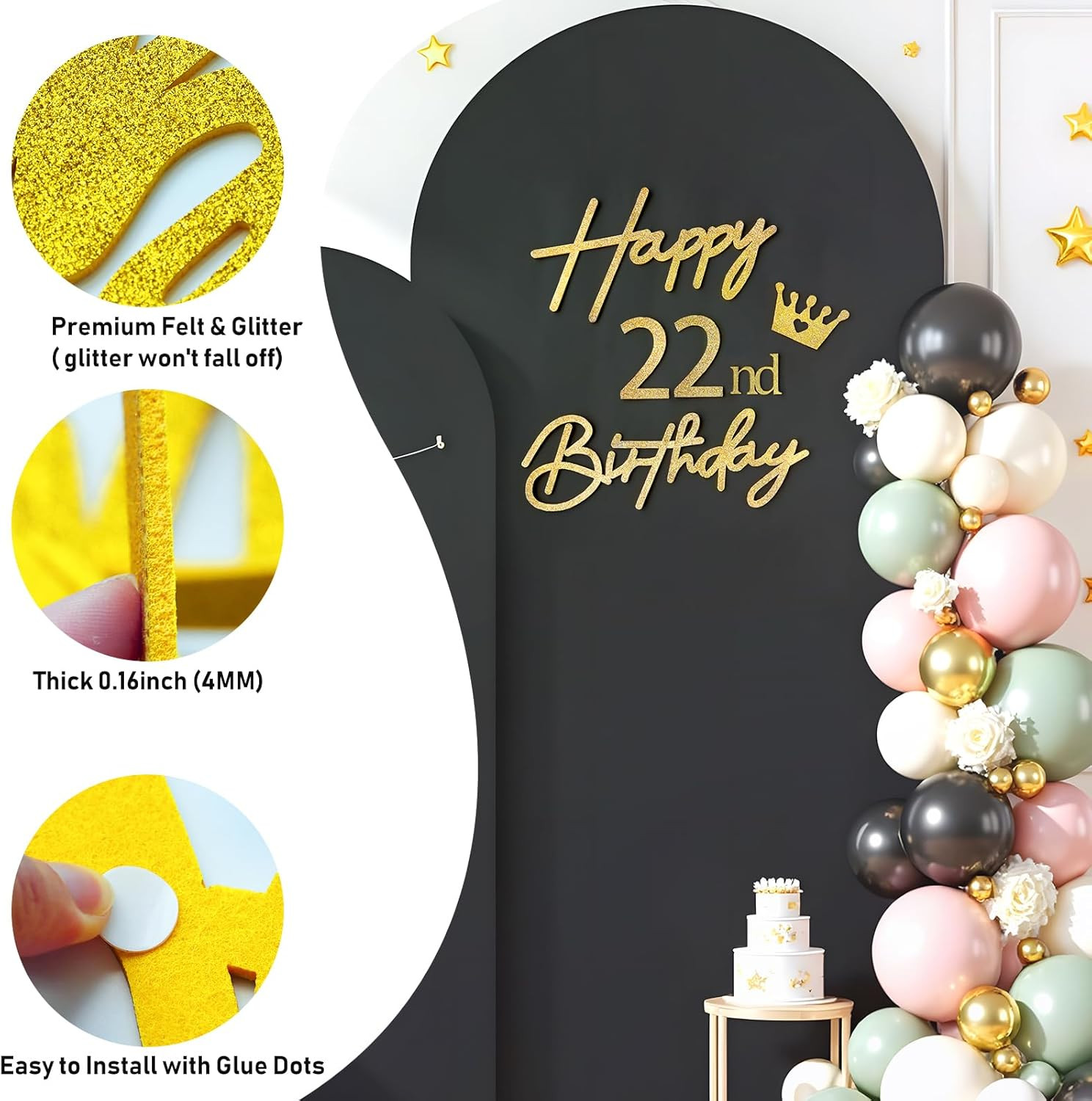 Included Components: 1x Gold Letters Happy Birthday Sign , 2x 0-9 Numbers with 60 Dots
