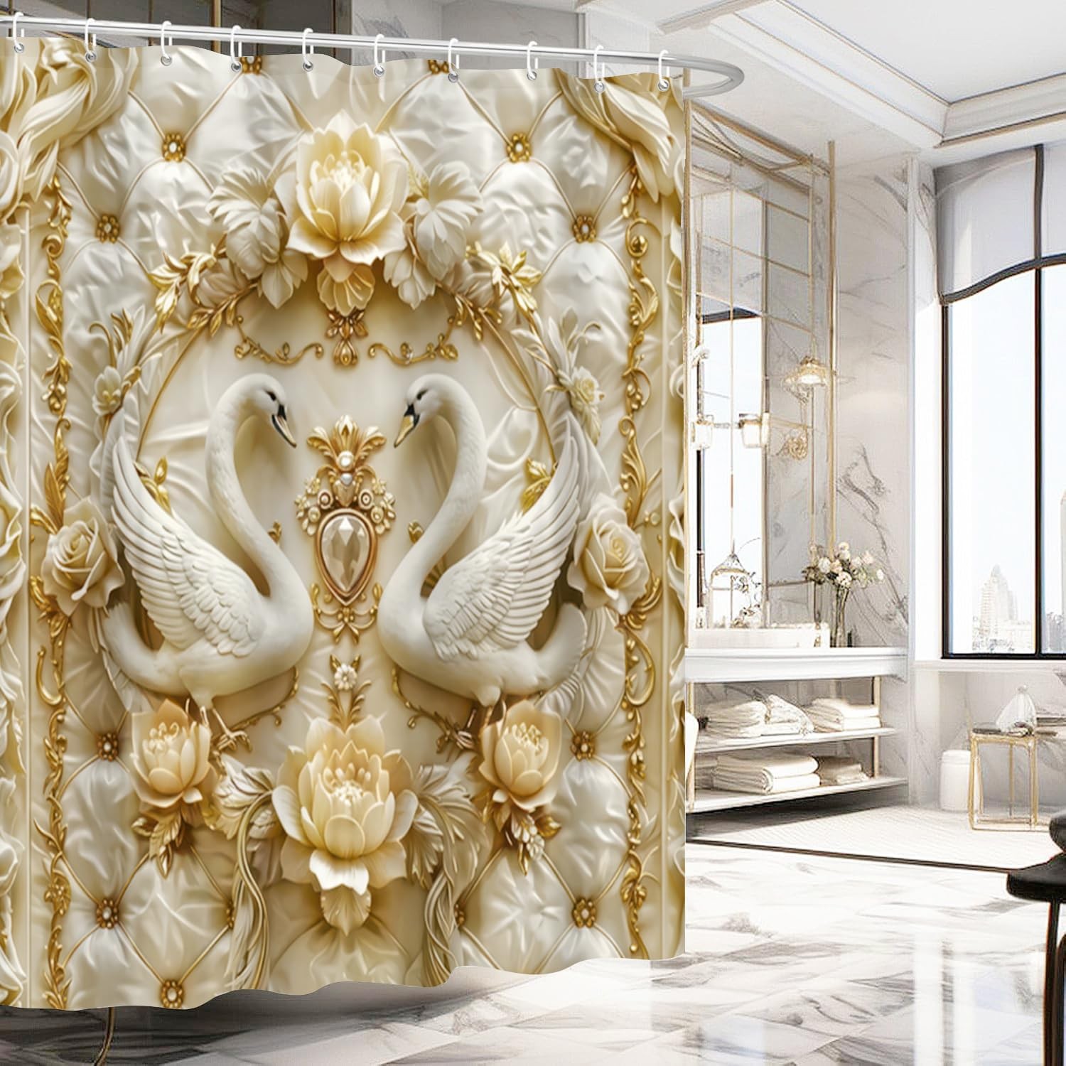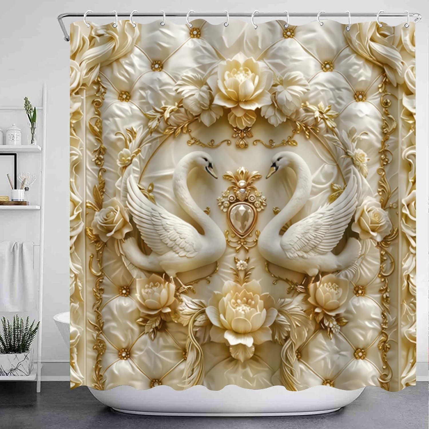 4Pcs Luxury Swan Reliefs Printed Shower Curtain Set with 12 Hooks Non-Slip Ru...