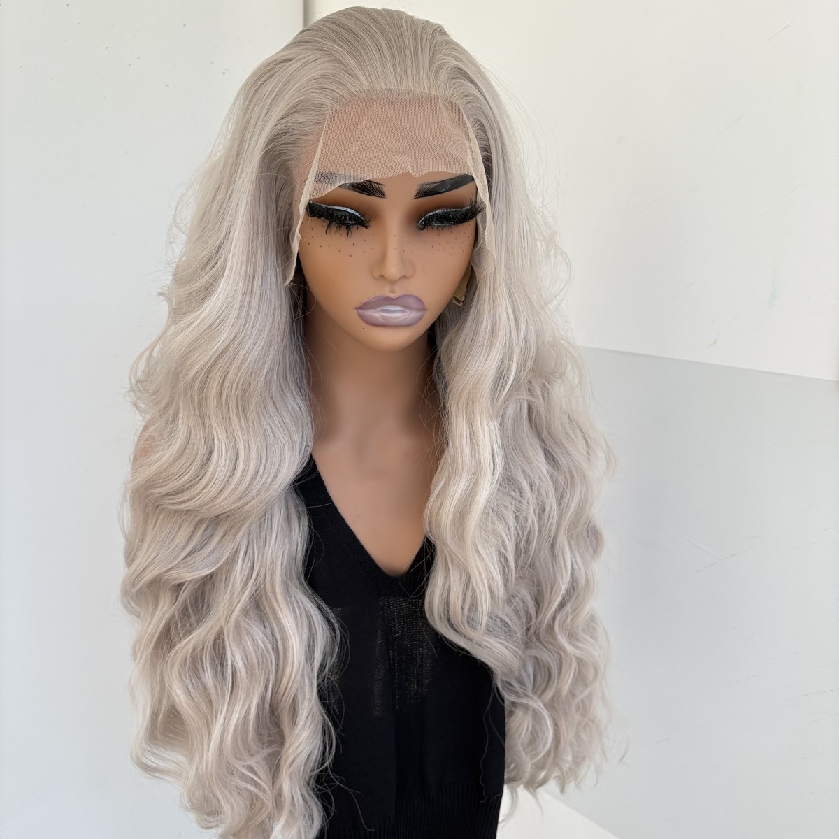 как выглядит Synthetic Hair Heat Resistant Frontal T Lace Wigs Silver gray Long Wavy Women фото