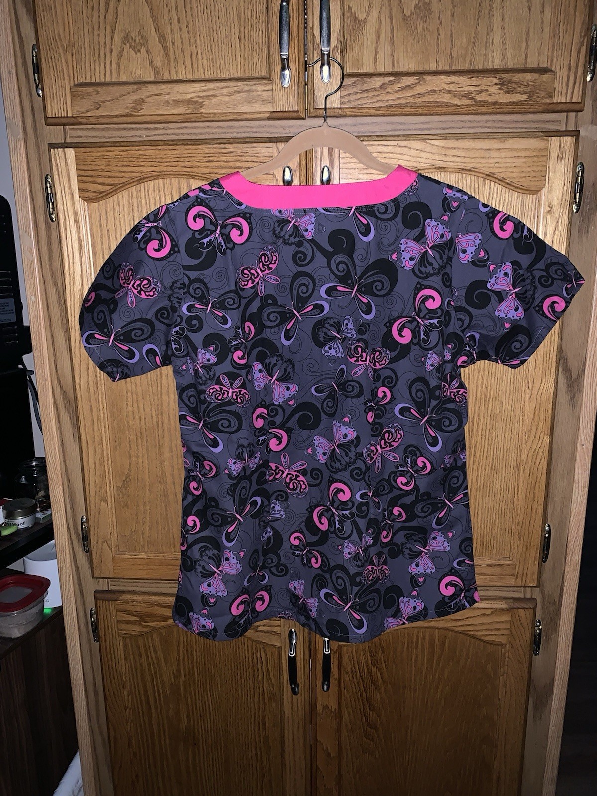 как выглядит NWOT Pink And Black Butterflies Scrub Top By UA Scrubs Size Medium фото