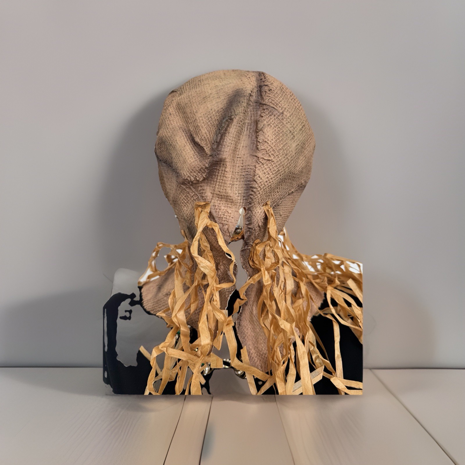 Scarecrow Halloween Full Overhead Burlap Mask Beige Black Raffia Metal Rings