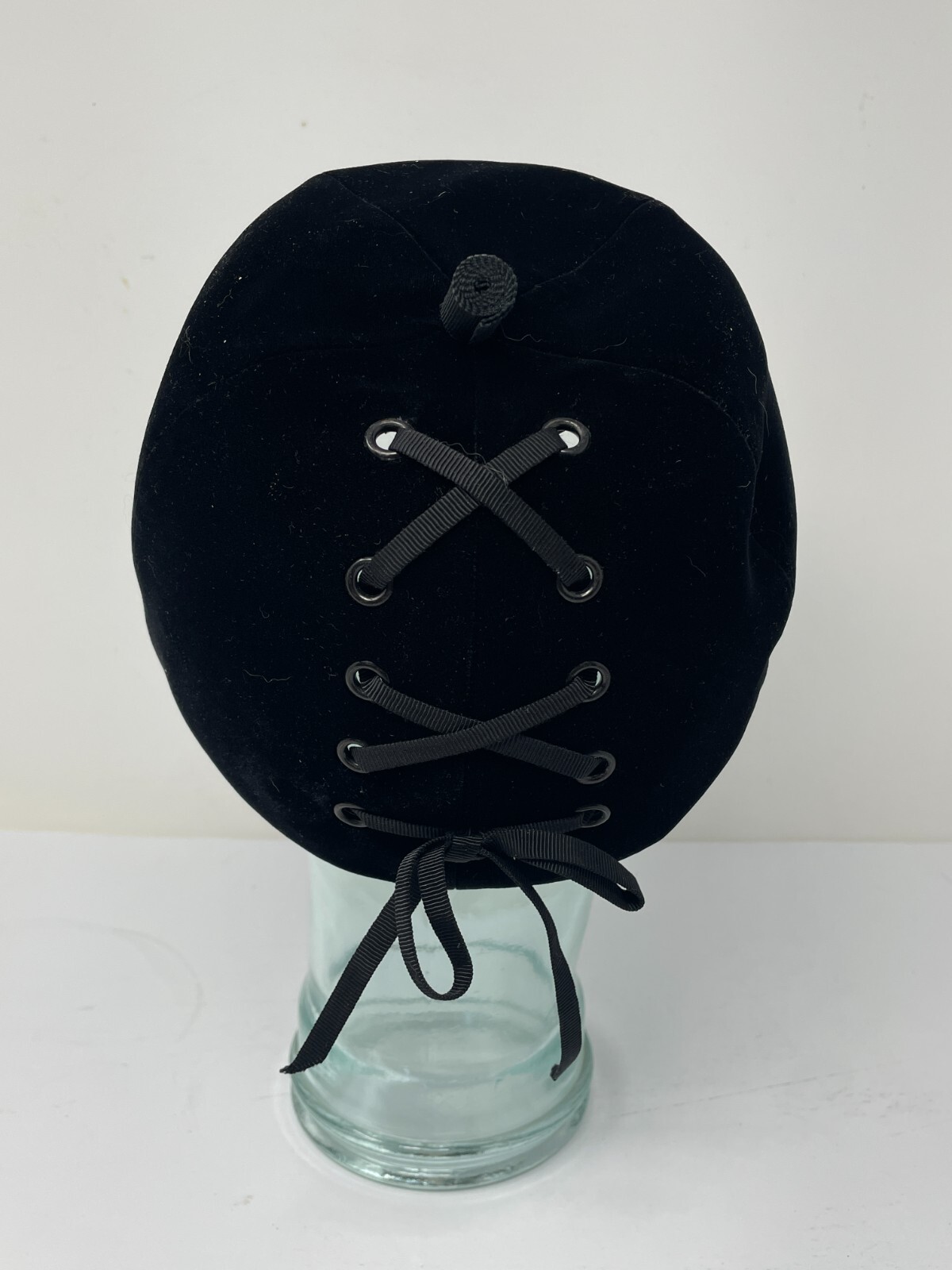 Vintage 1950s Lucila Mendez Designer Black Velvet Toque Hat Lace-Up Back Size 22