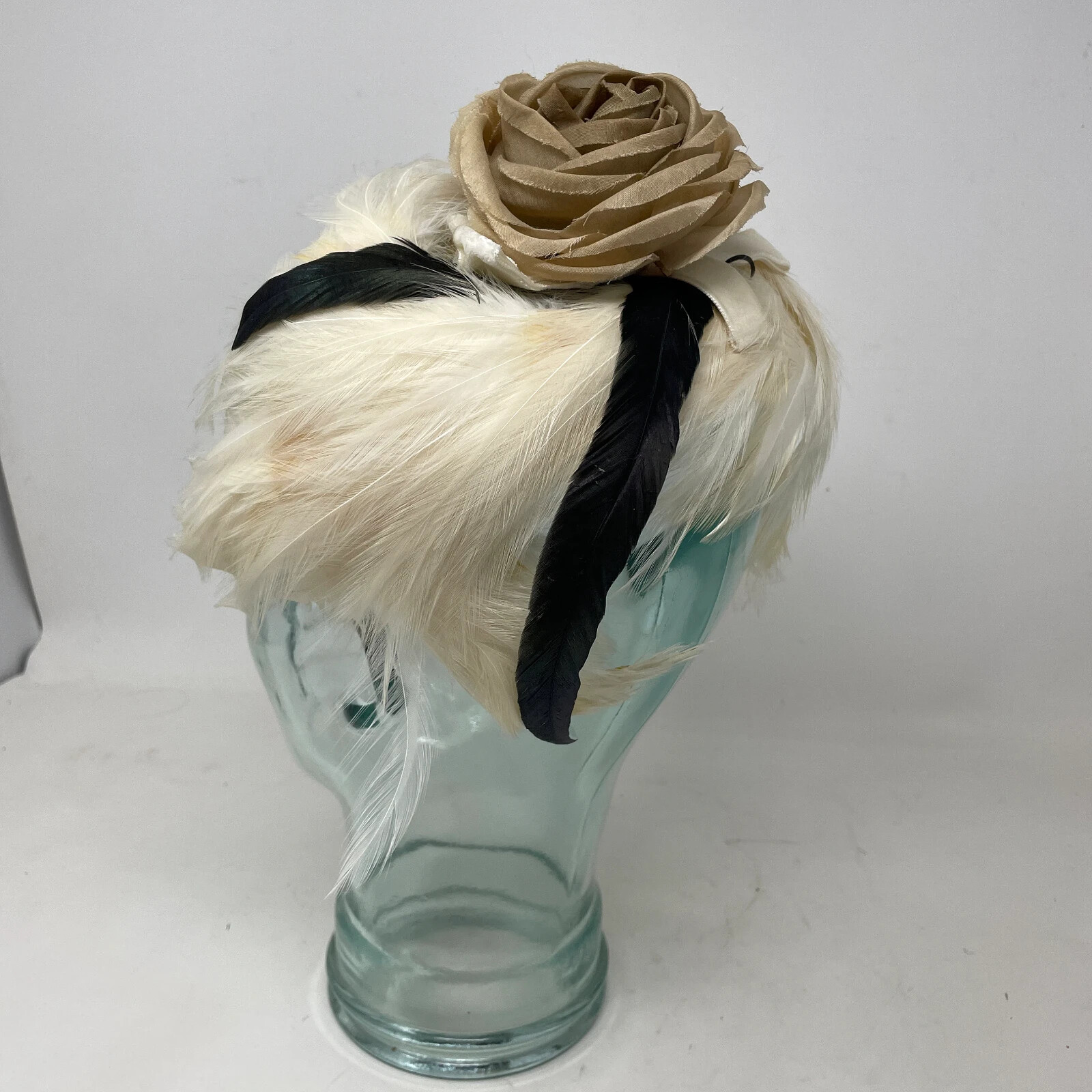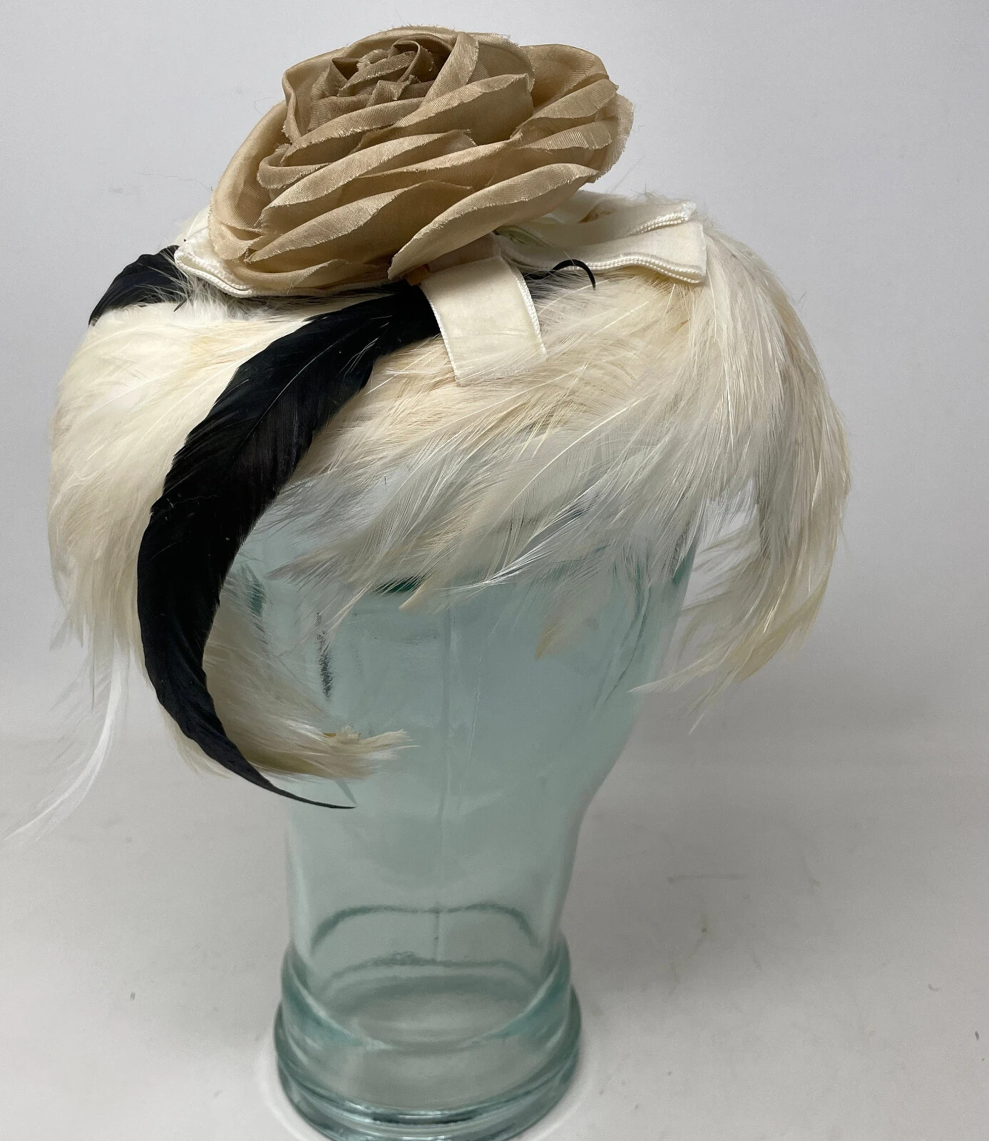 Vintage 1950s Juliette Cap Feather Hat White Feathers Beige Rosette Fascinator
