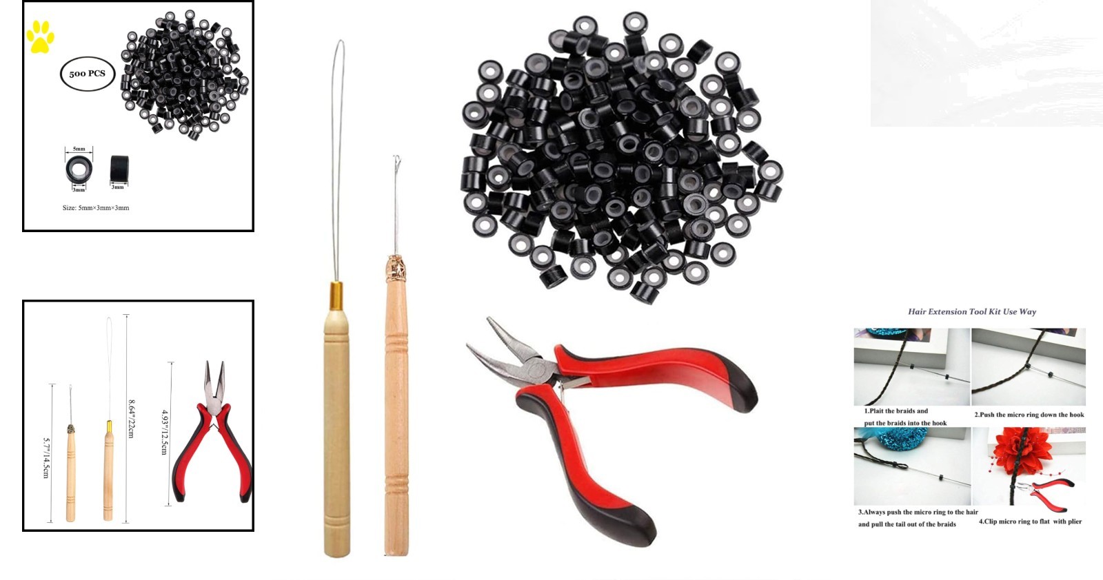 как выглядит Black Professional Hair Extension Tools with 500 Silicone Rings for Easy Styling фото