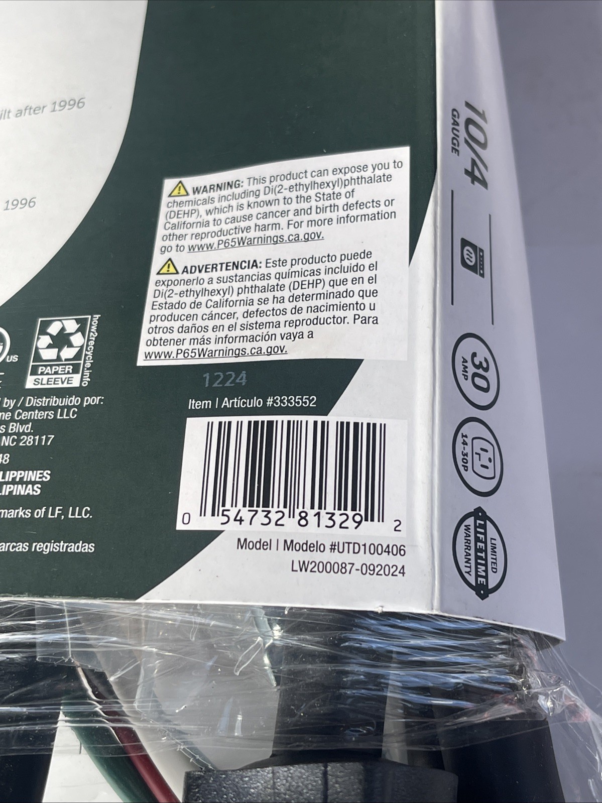 UTILITECH DRYER CORD - 6 ft - 4 Prong Plug - 10/4 Gauge - 30 AMP-0333552 New