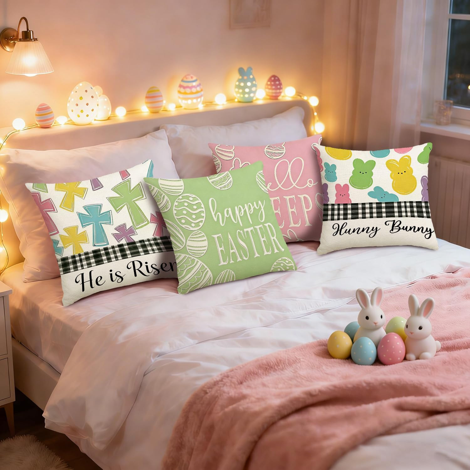 Happy Easter Pillow Covers 18X18 Inch Set of 4, Bunny Hello Peeps He Is Risen Eg