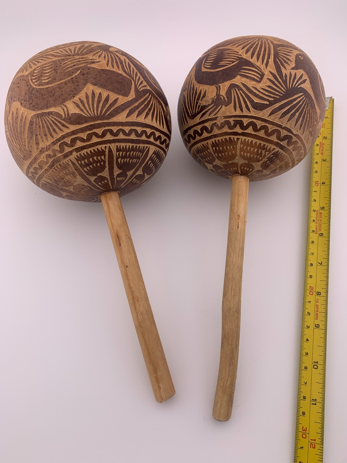 Vintage Hand Carved Wooden Maracas Set Folk Art Etched Gourd Rattles Decor