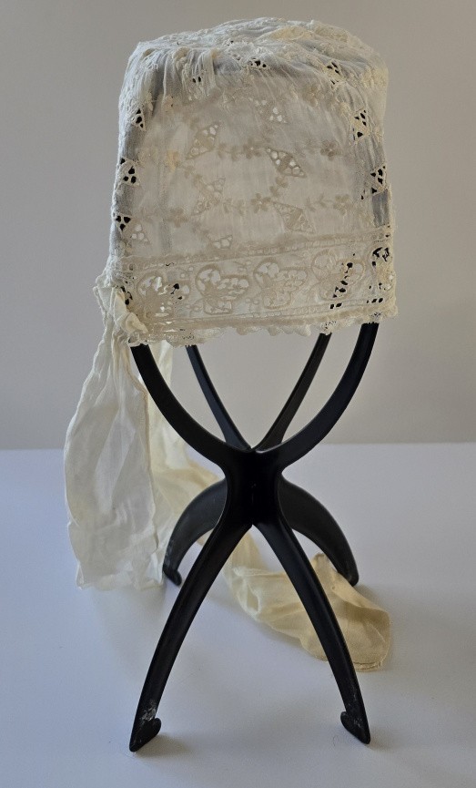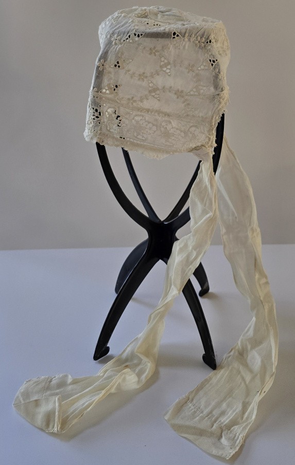 Antique Victorian Edwardian Baby Bonnet Cotton Eyelet Embroidery Linen Ties
