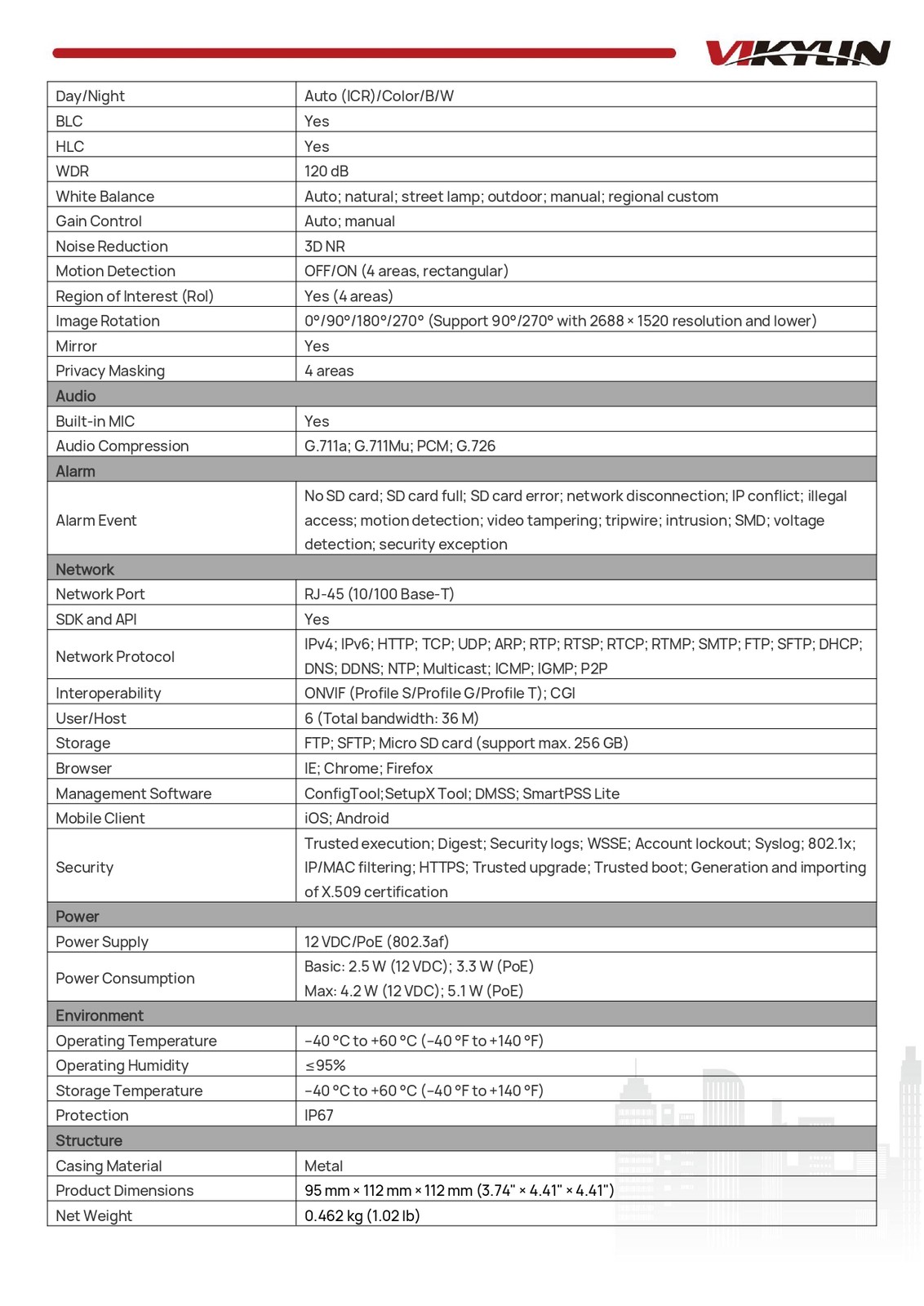 Особенности: Dual light, Color+IR, 2688x1520, IR and warm Light range to 30m, Smart Motion Detection, Human & Vehicle detection, Perimeter Protection, H.265+ & H.265 & H.264, Support Alarm Snapshot to Email, FTP, IP67