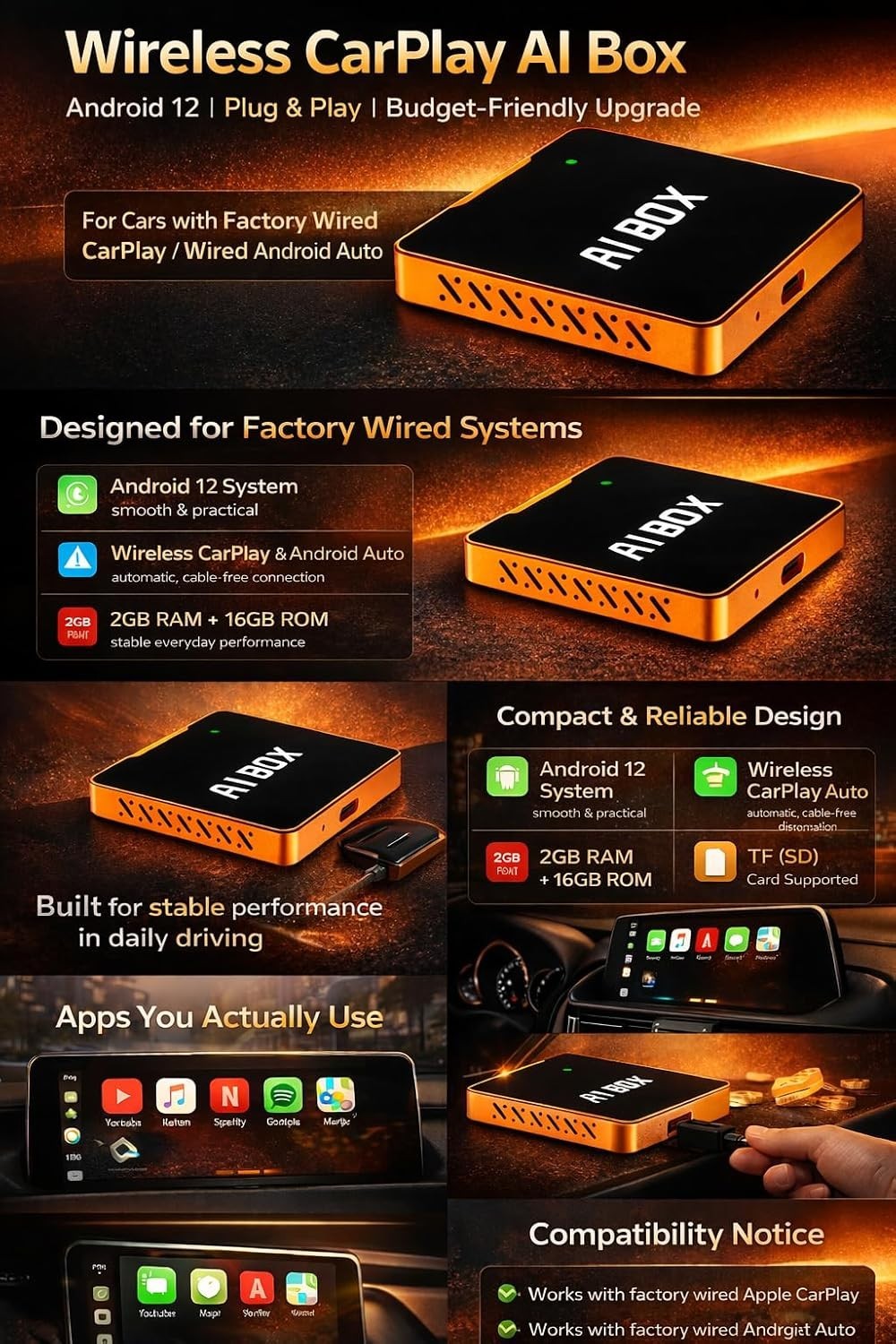Compatible Vehicle Make: The vehicle must have wired CarPlay or wired Android Auto.