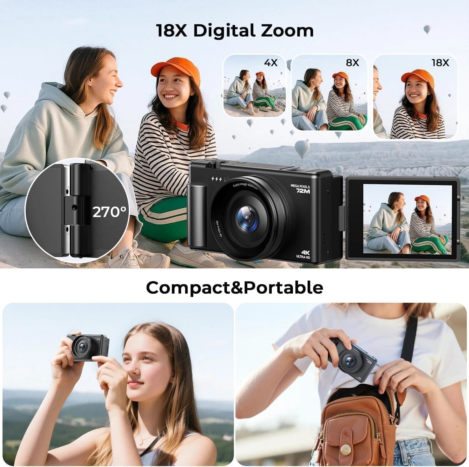 Особенности: 18x Digital Zoom, 270° Flip Screen, 4K Video Recording, Auto Focus, Built-in Flash, Image Stabilization, Time Lapse, YouTube Mode