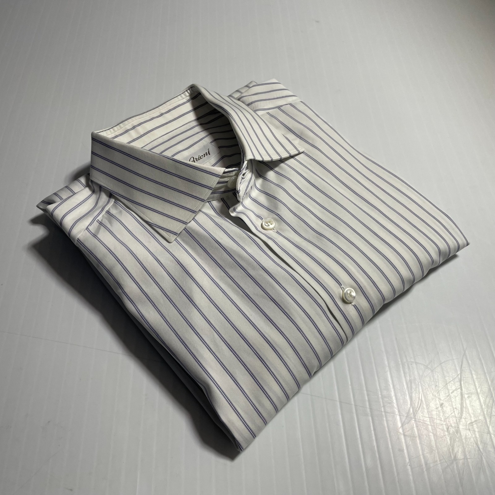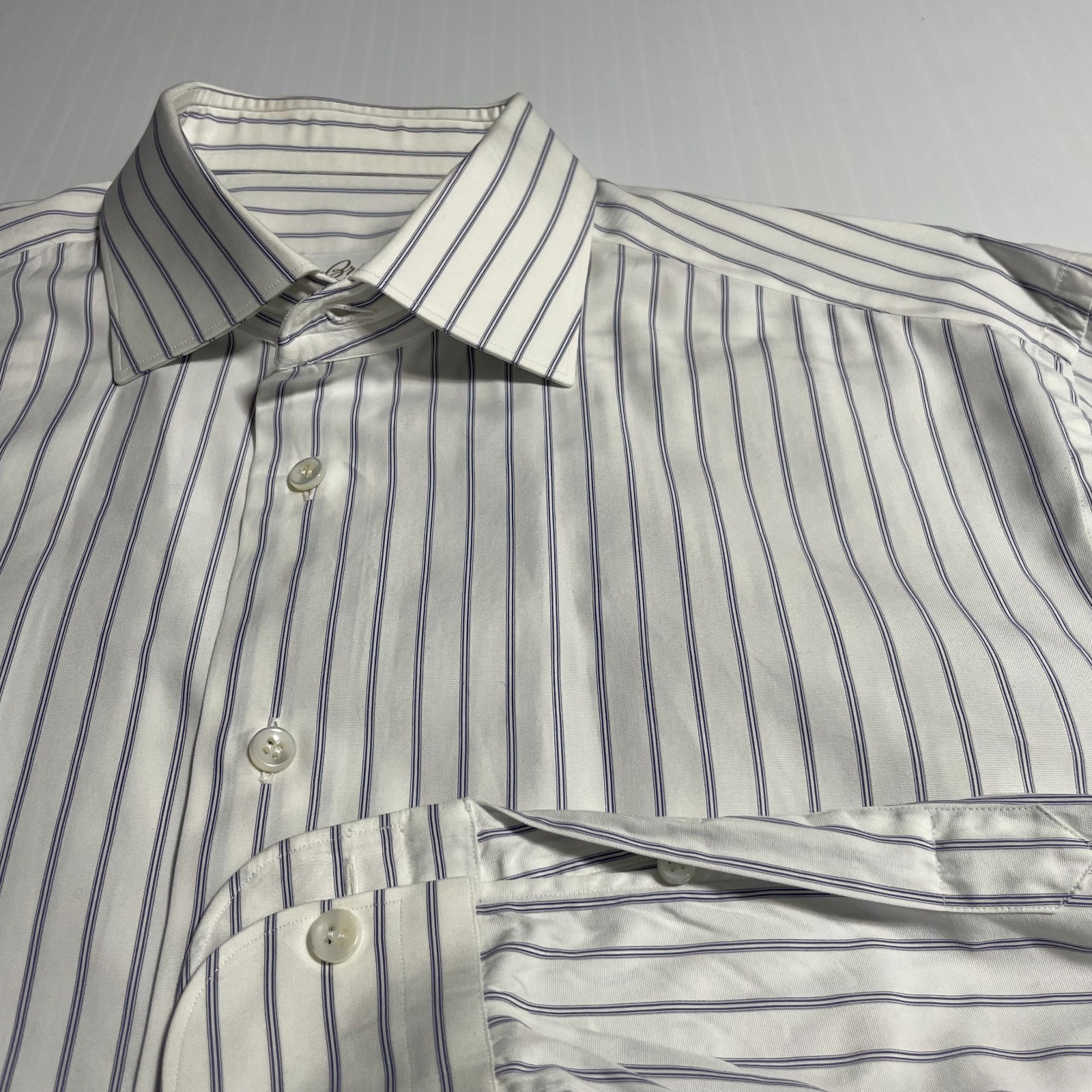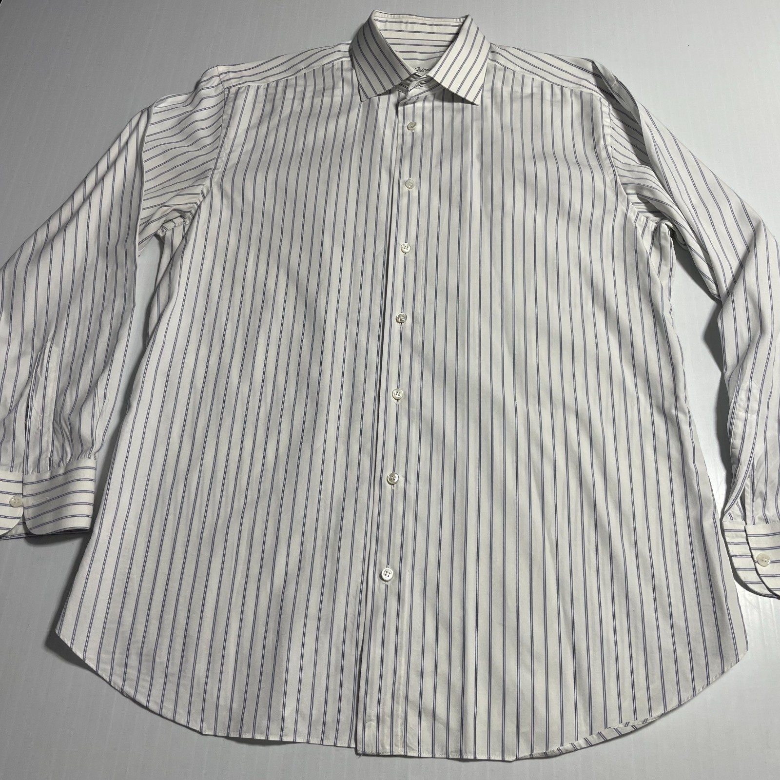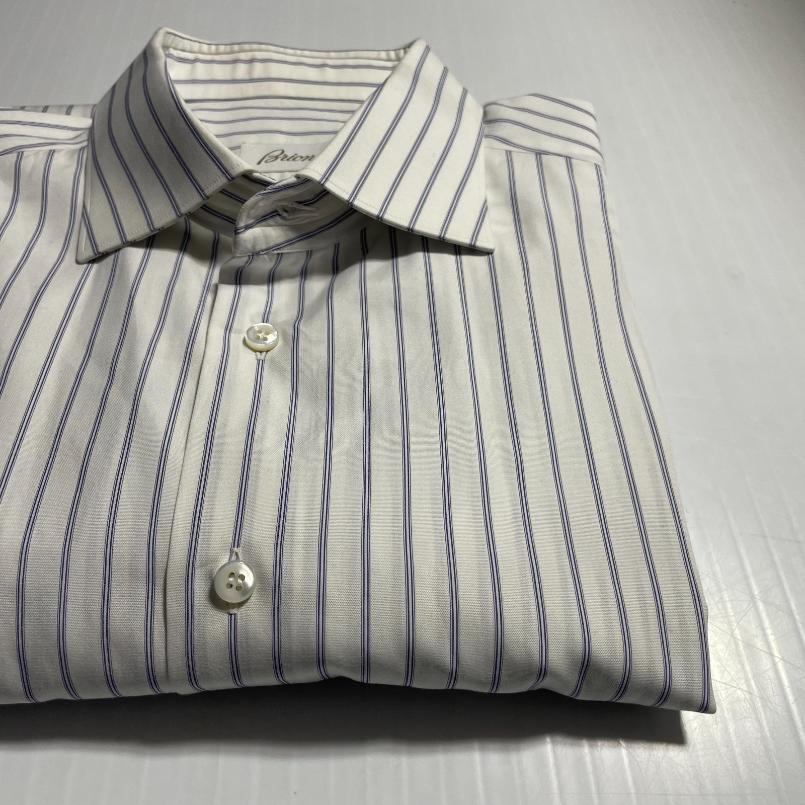 как выглядит Brioni Italy Dress Shirt White Blue Stripe Cotton Colosseo 17.5 44 фото