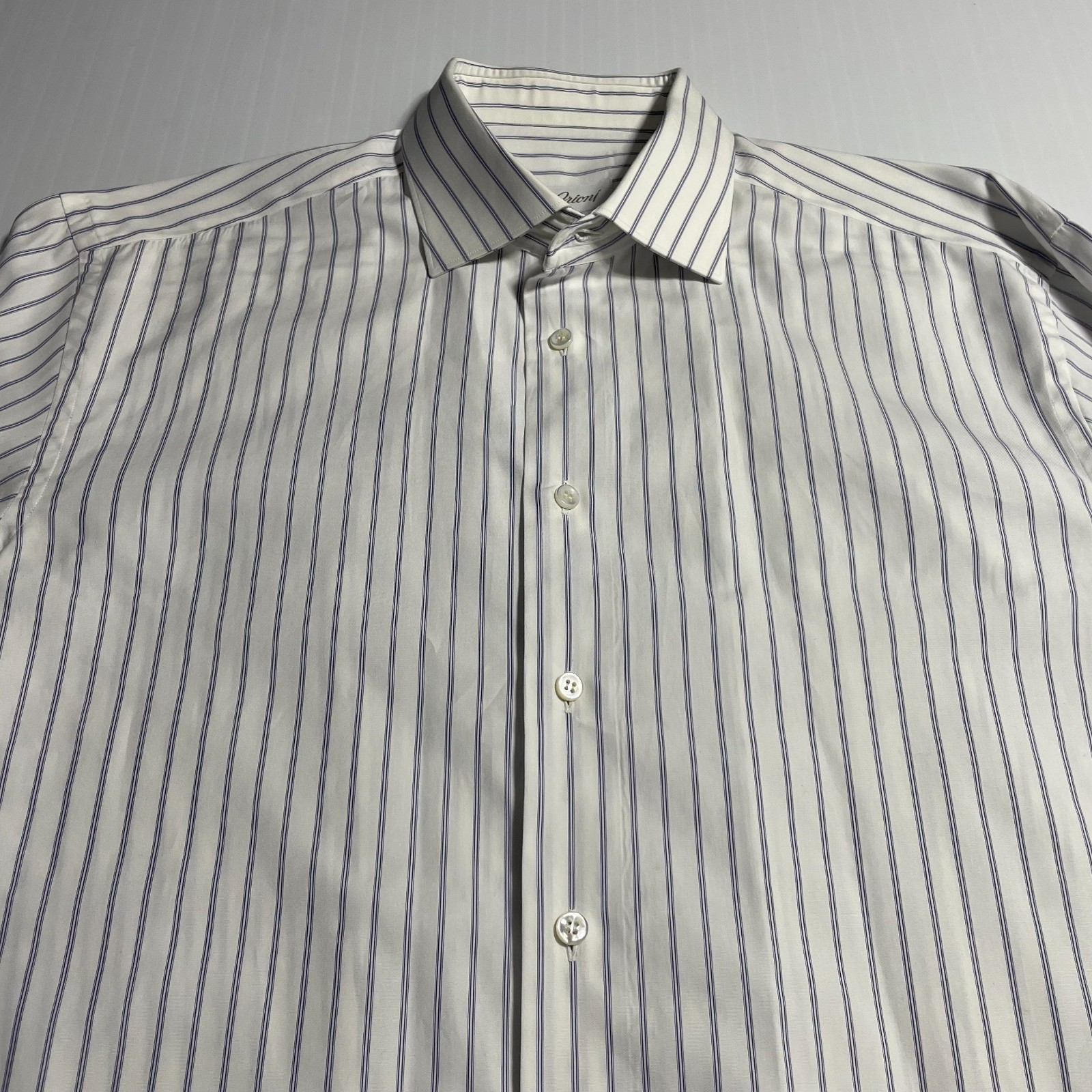 Brioni Italy Dress Shirt White Blue Stripe Cotton Colosseo 17.5 44