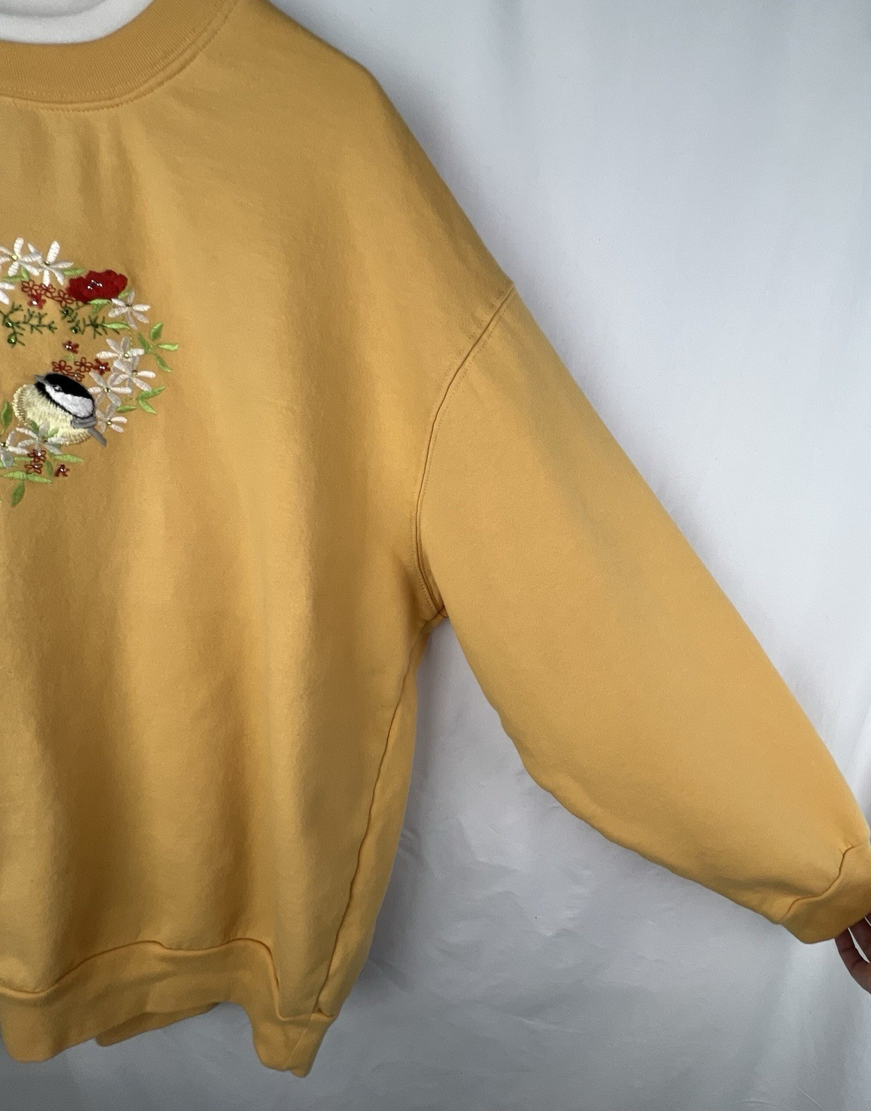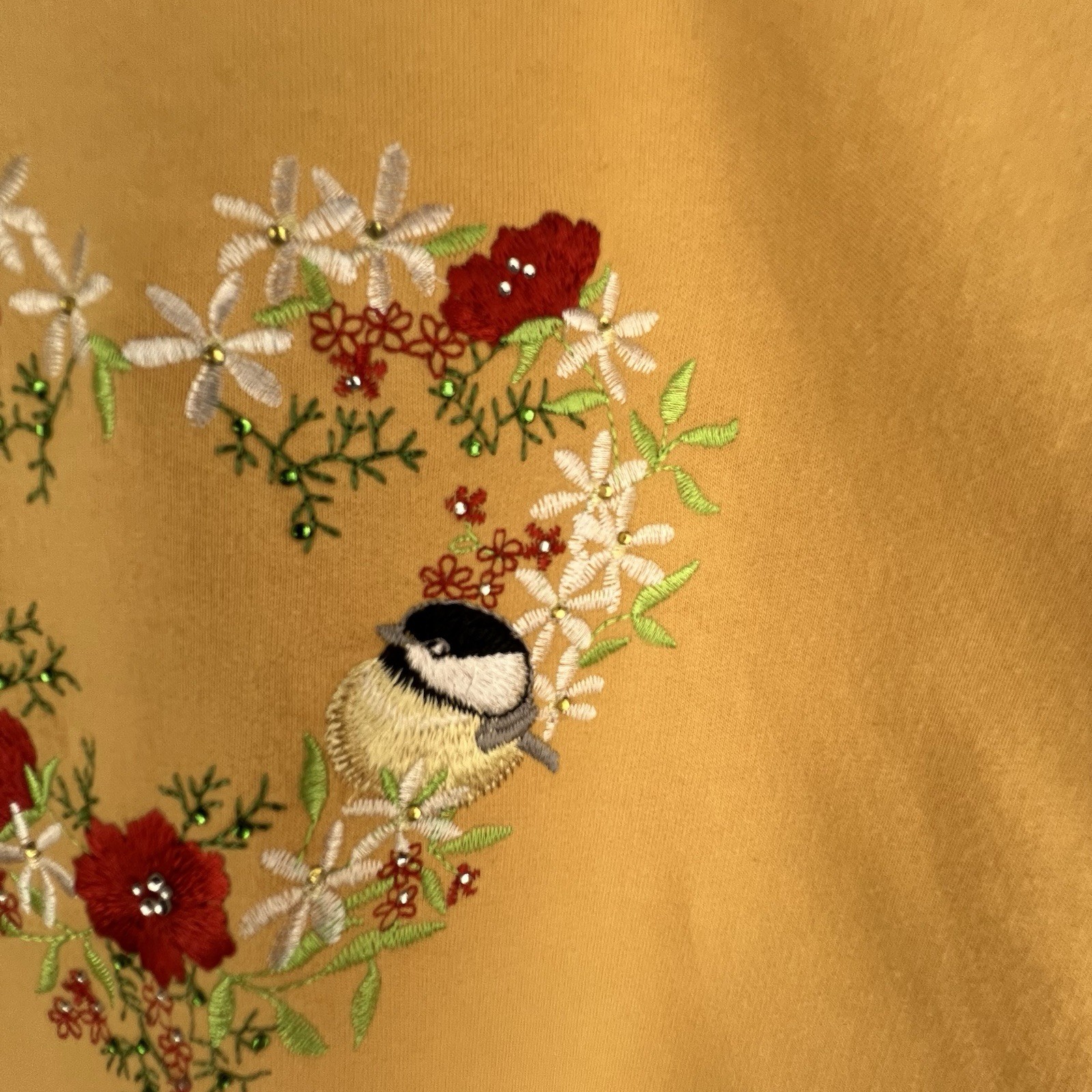 как выглядит Vtg Morning Sun Yellow Embroidered Bird Floral Heart Sweatshirt 2XL Cottagecore фото
