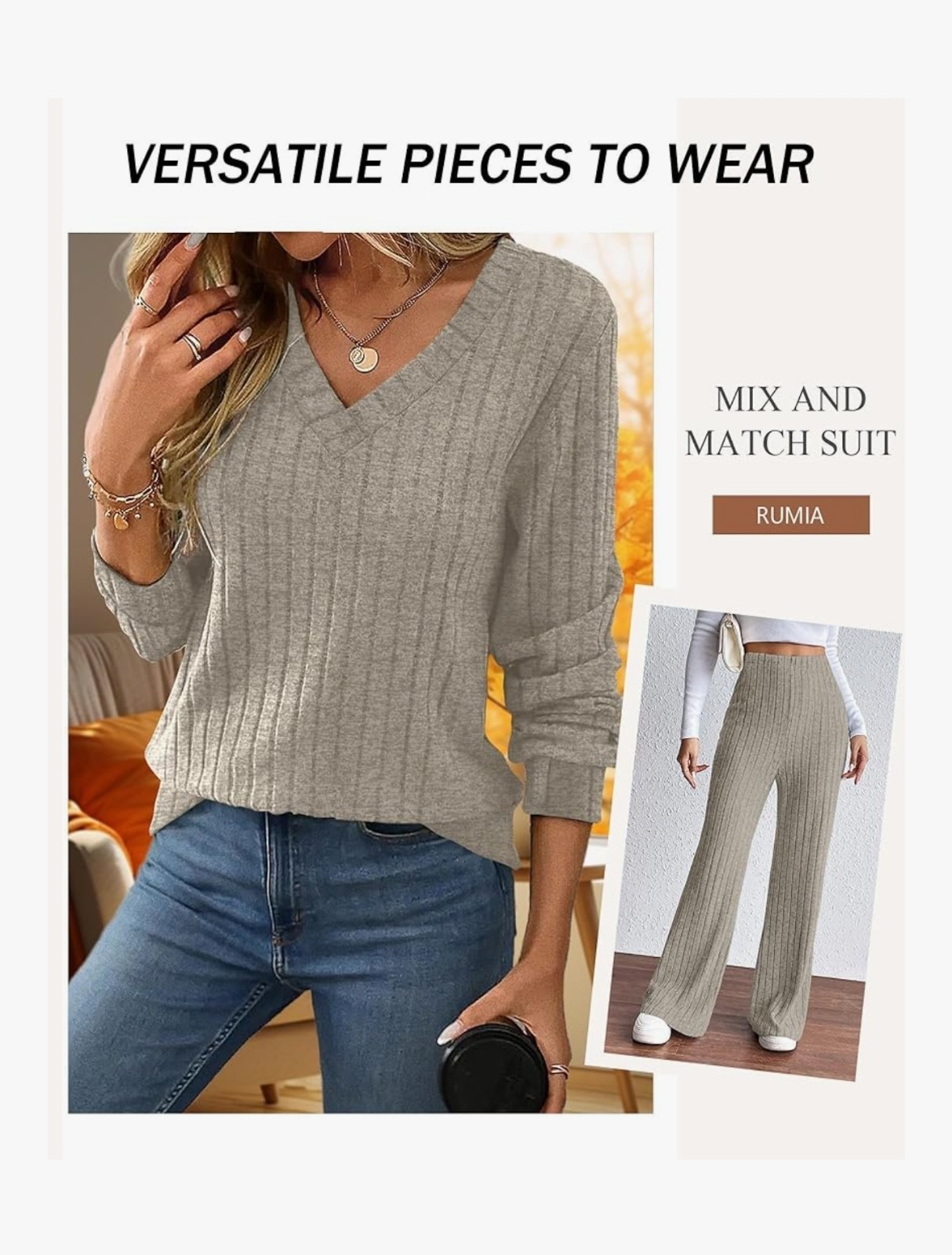 как выглядит Rumia Beige Ribbed Knit V-Neck Long Sleeve Jogger Top and Pants Set for Women фото