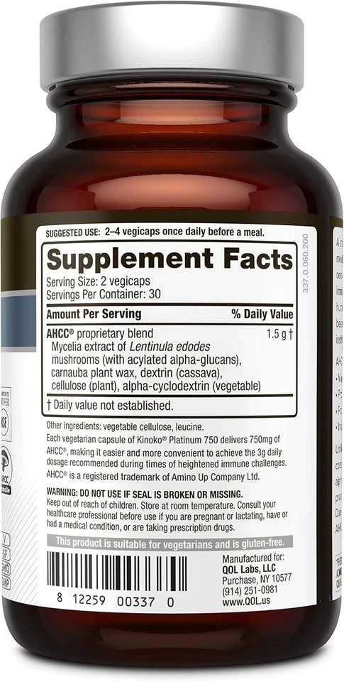 Quality of Life Kinoko Platinum AHCC 750mg Immune Support Supplement 60 vegicaps