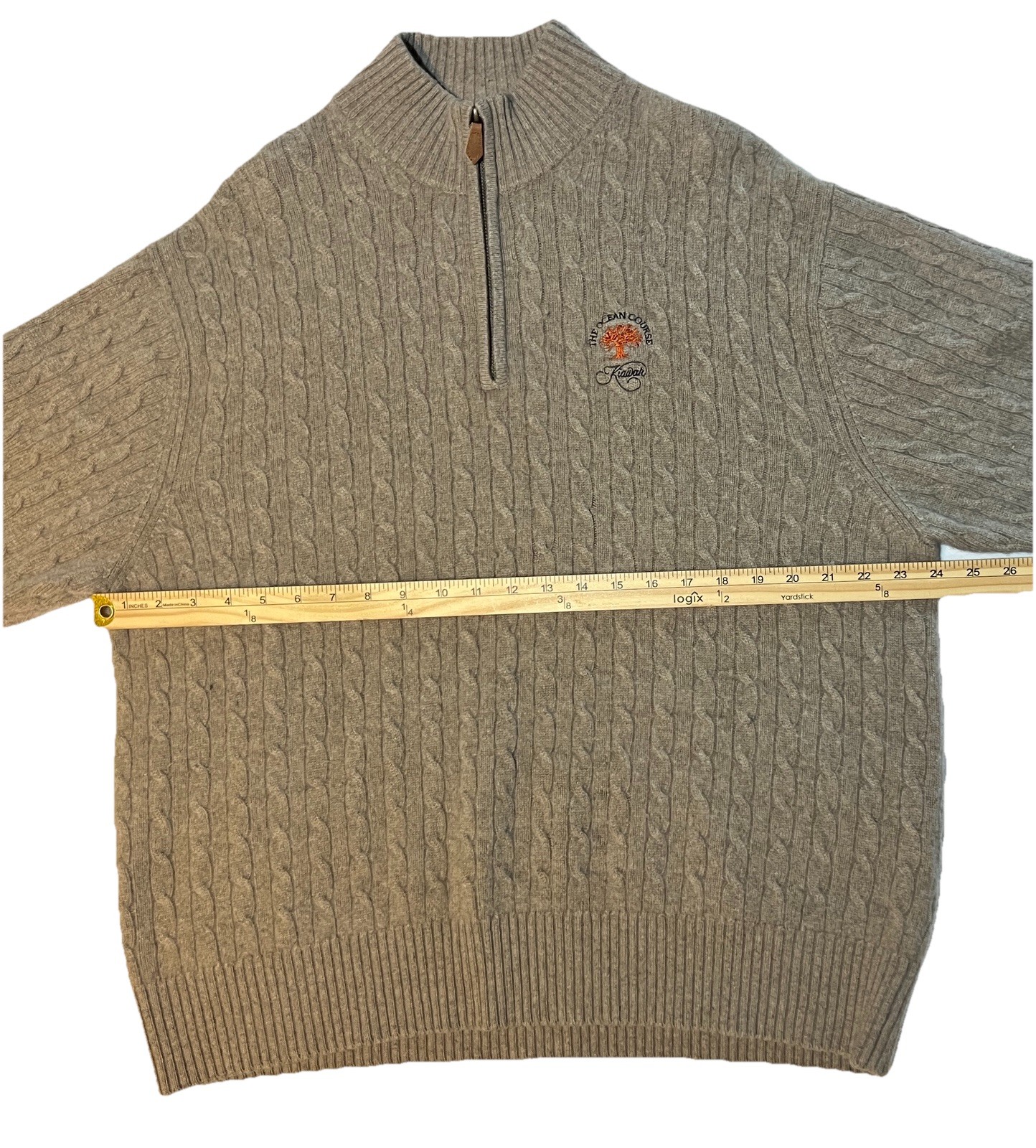 как выглядит Kiawah Ocean Course Peter Millar 100 Cashmere Cable Knit 1/4 Zip Large Camel A3 фото