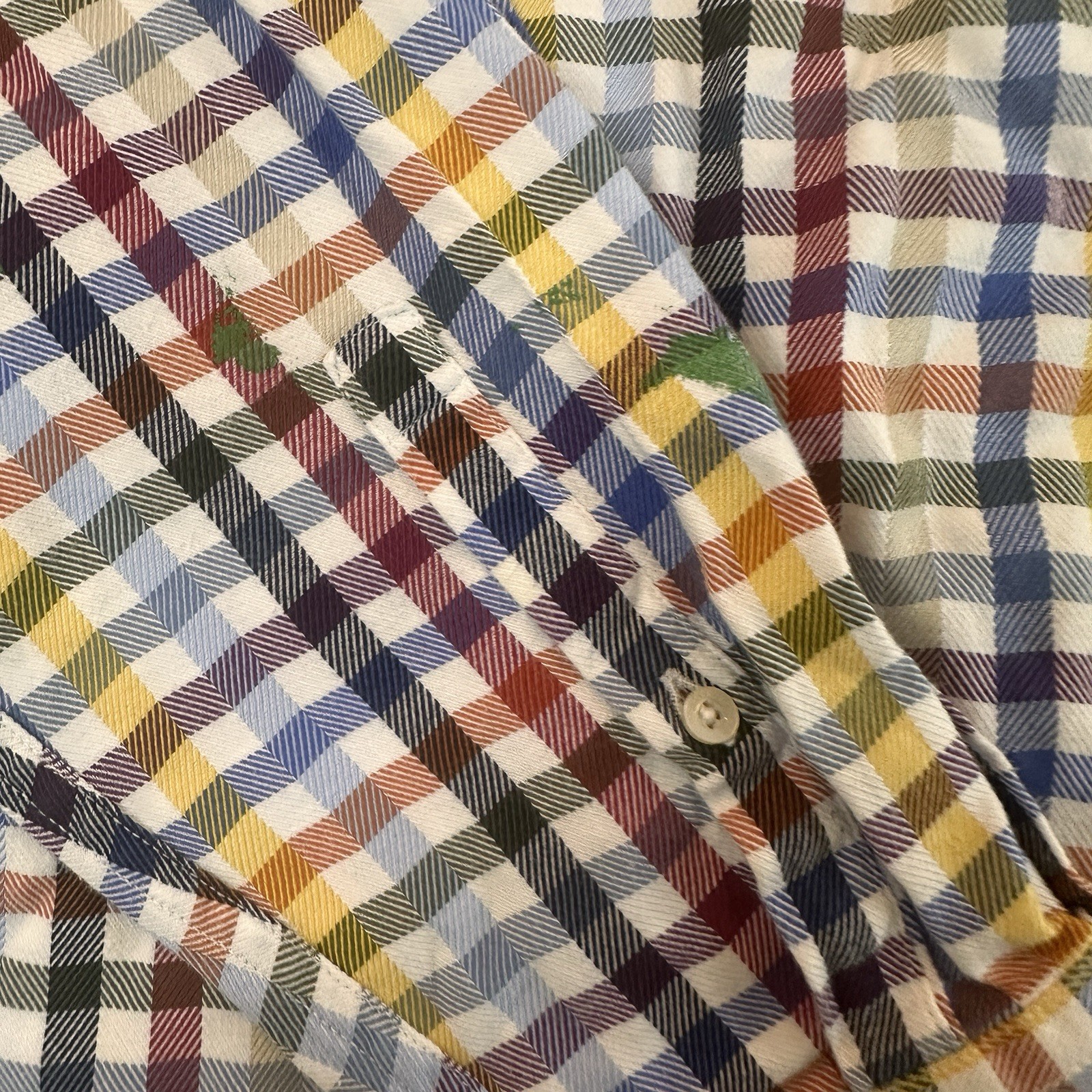 как выглядит Alan Flusser Mens XL Dress Shirt Multi Color Plaid STAIN ON SLEEVE SEE PICS 521 фото