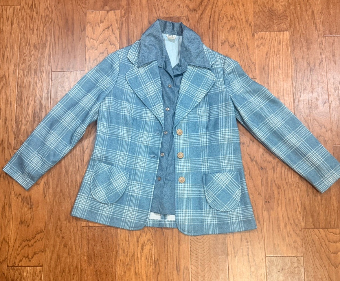 Vintage 1970s 3 Piece Leisure Suit Womens Knit Blue Denim-look Plaid Large 10-12