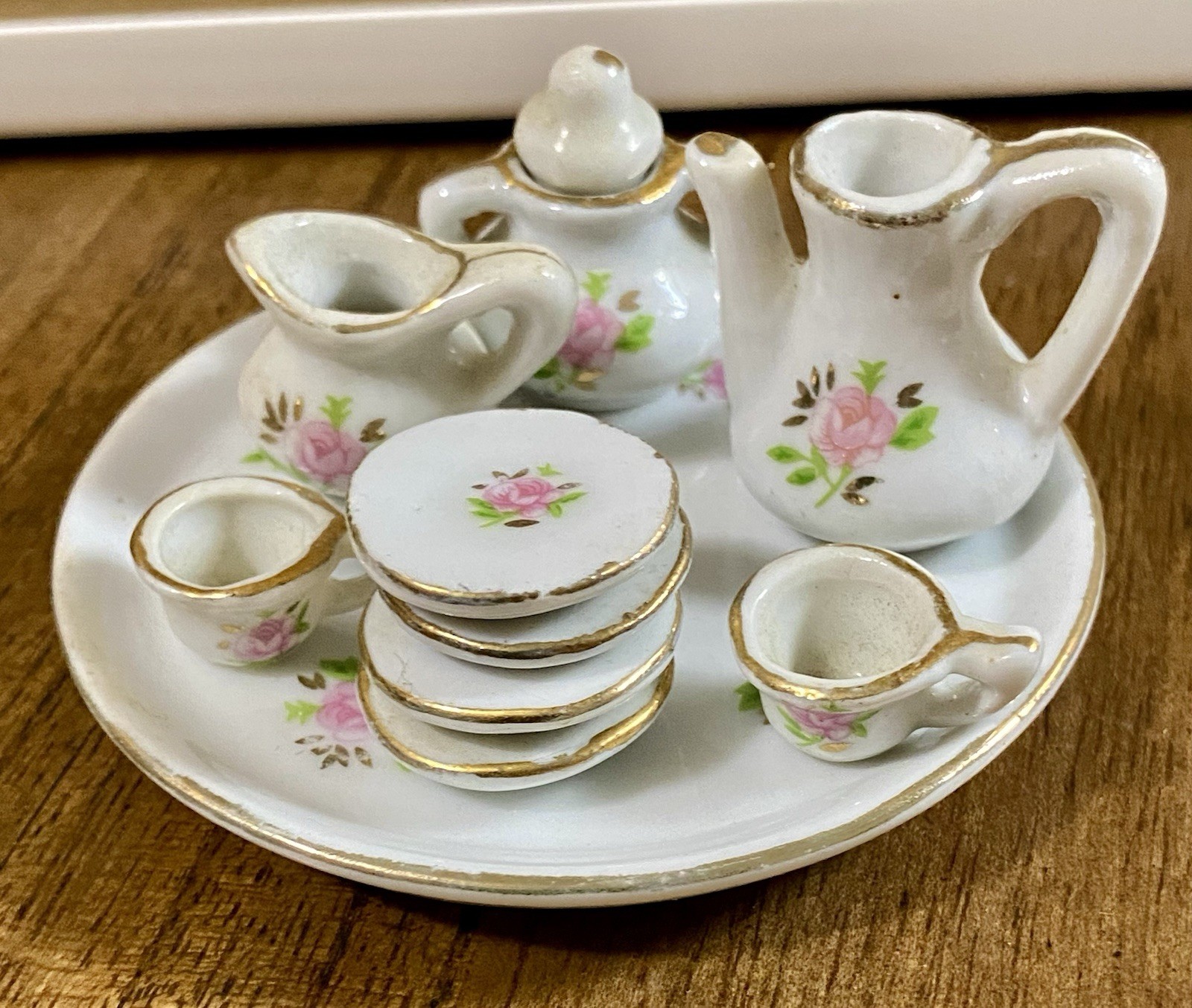 10-Piece Porcelain Miniature Tea Set with Tray, Pink Flowers Gold Trim