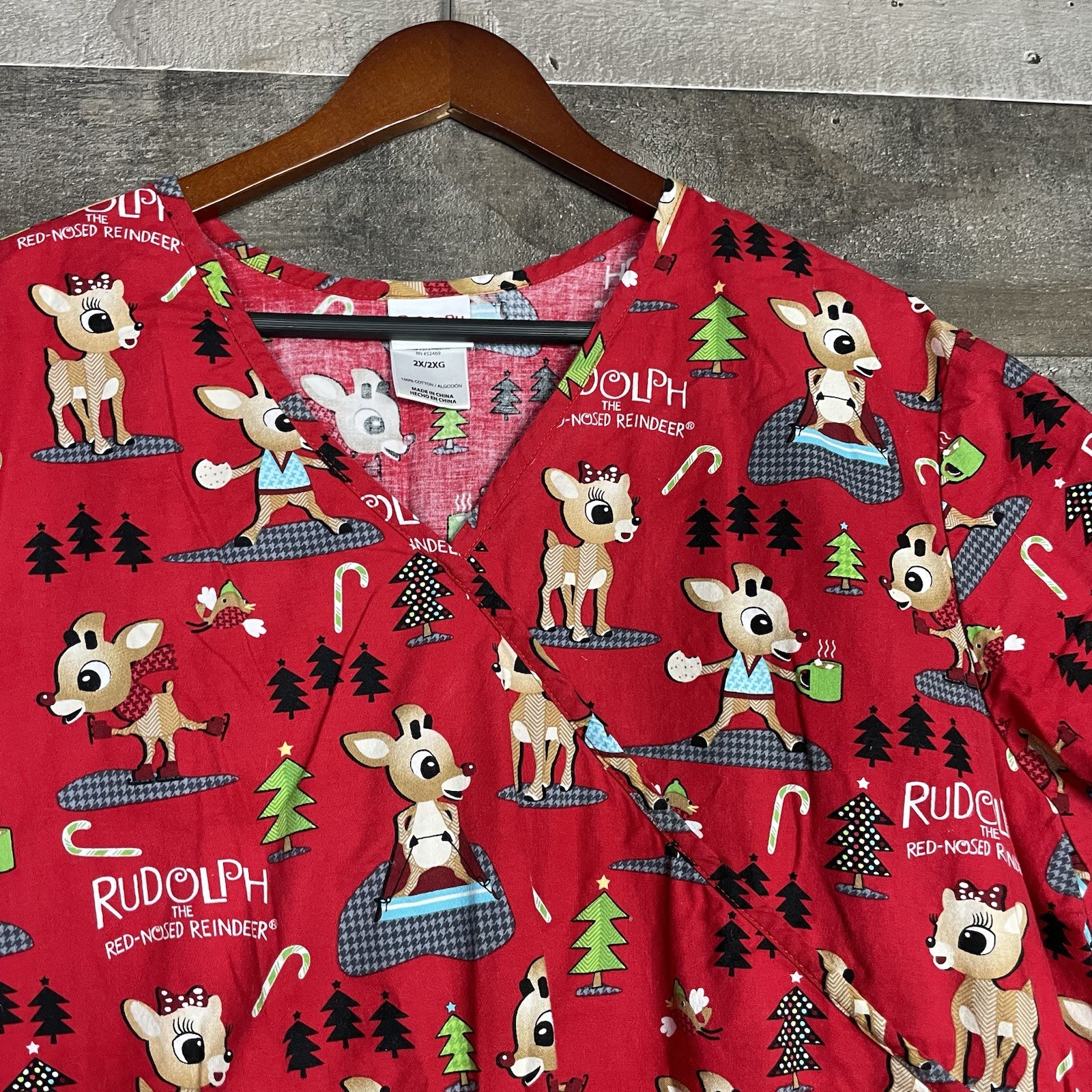 Rudolph The Red Nosed Reindeer Medical Scrub Top Size 2X Christmas Uniform