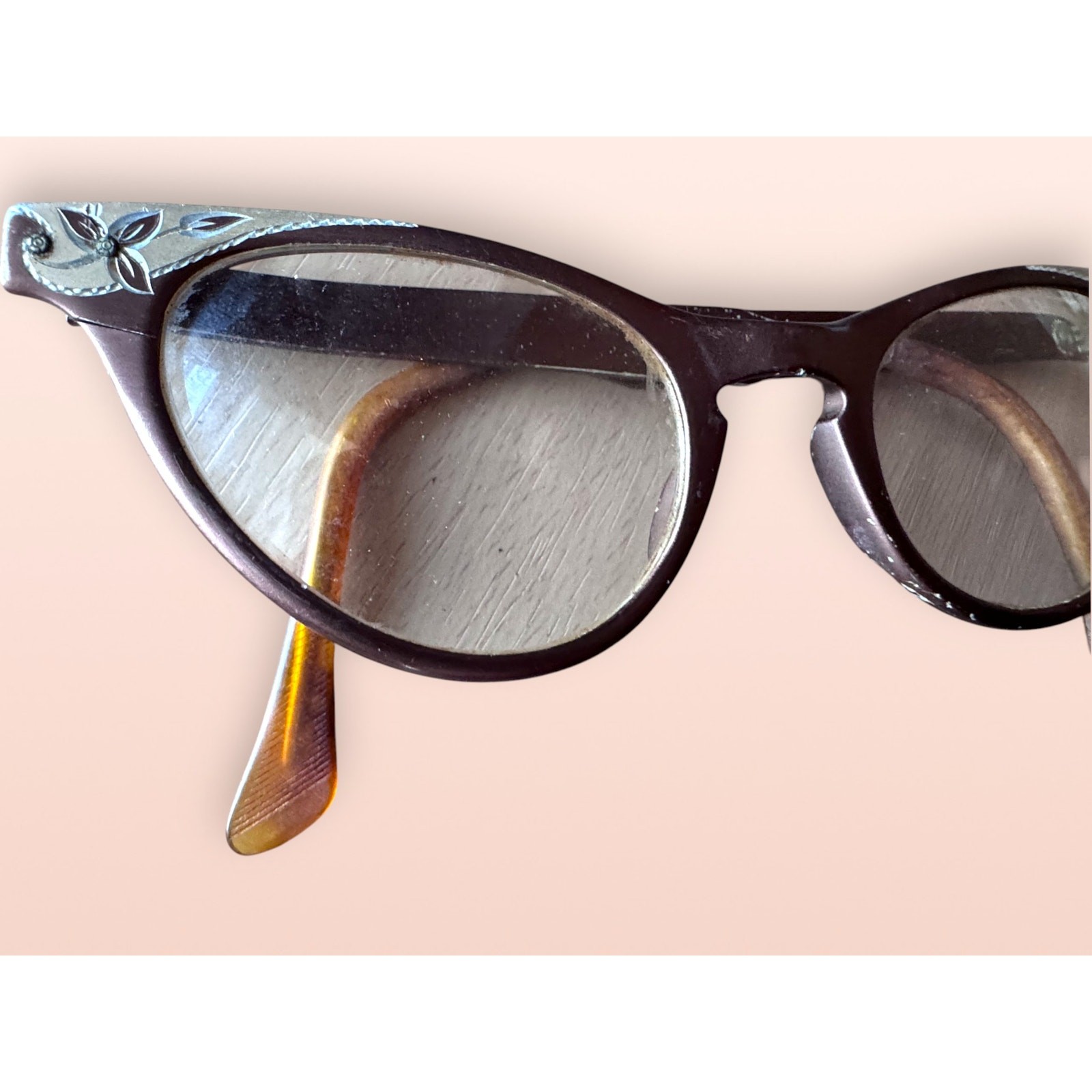 как выглядит Vintage 1950s Art-Craft Aluminum Cat Eye Glasses  Frames with Floral Inlay фото