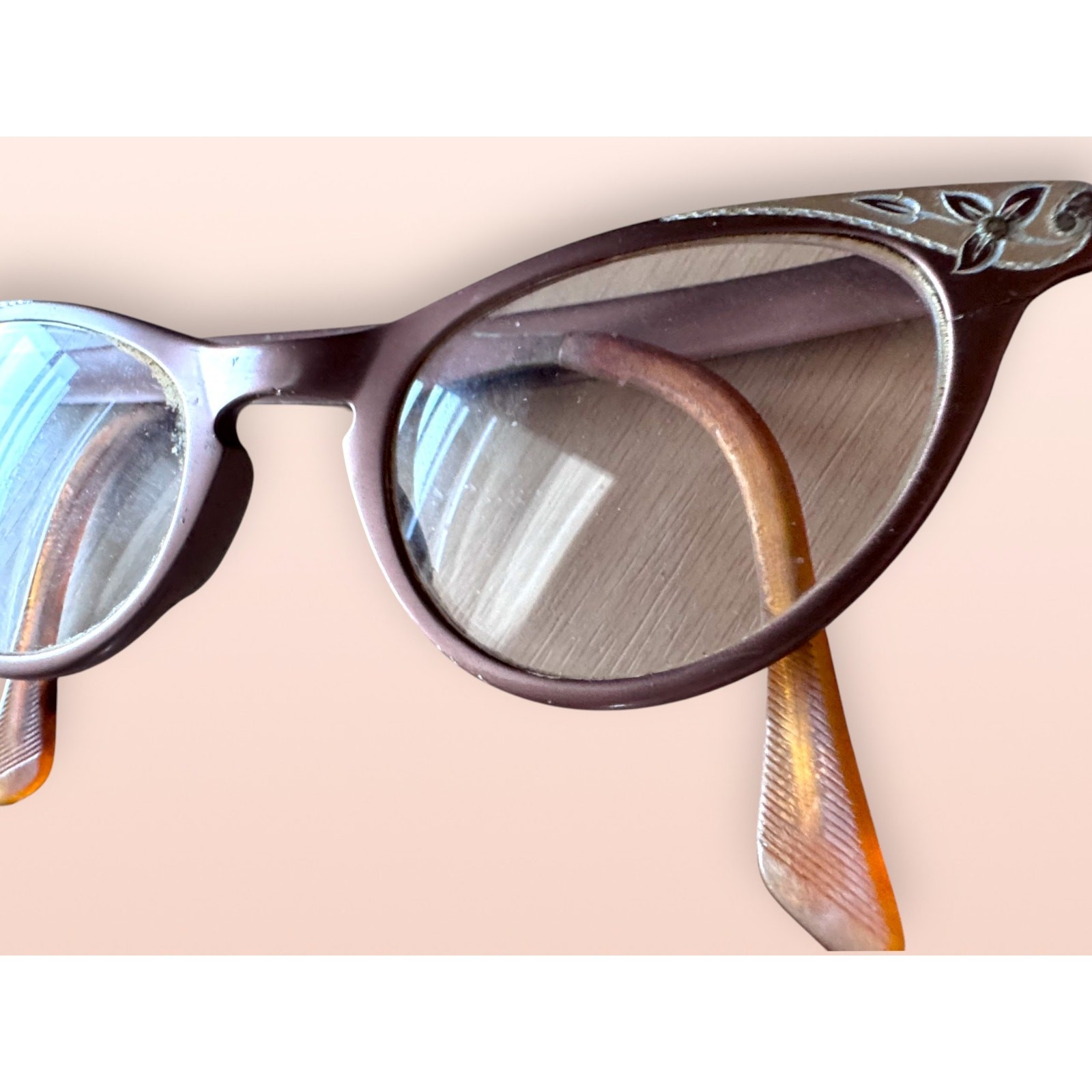 Vintage 1950s Art-Craft Aluminum Cat Eye Glasses Frames with Floral Inlay