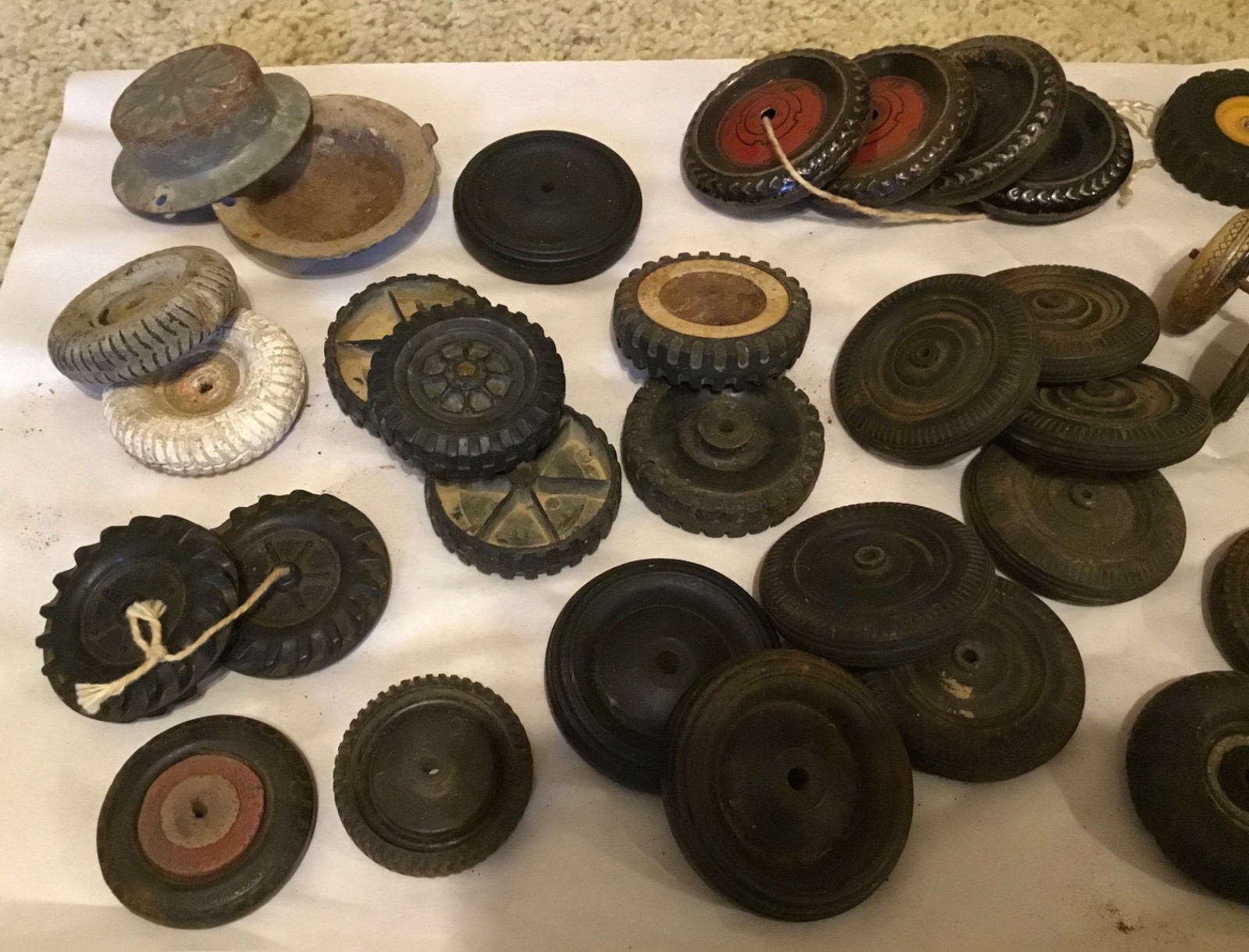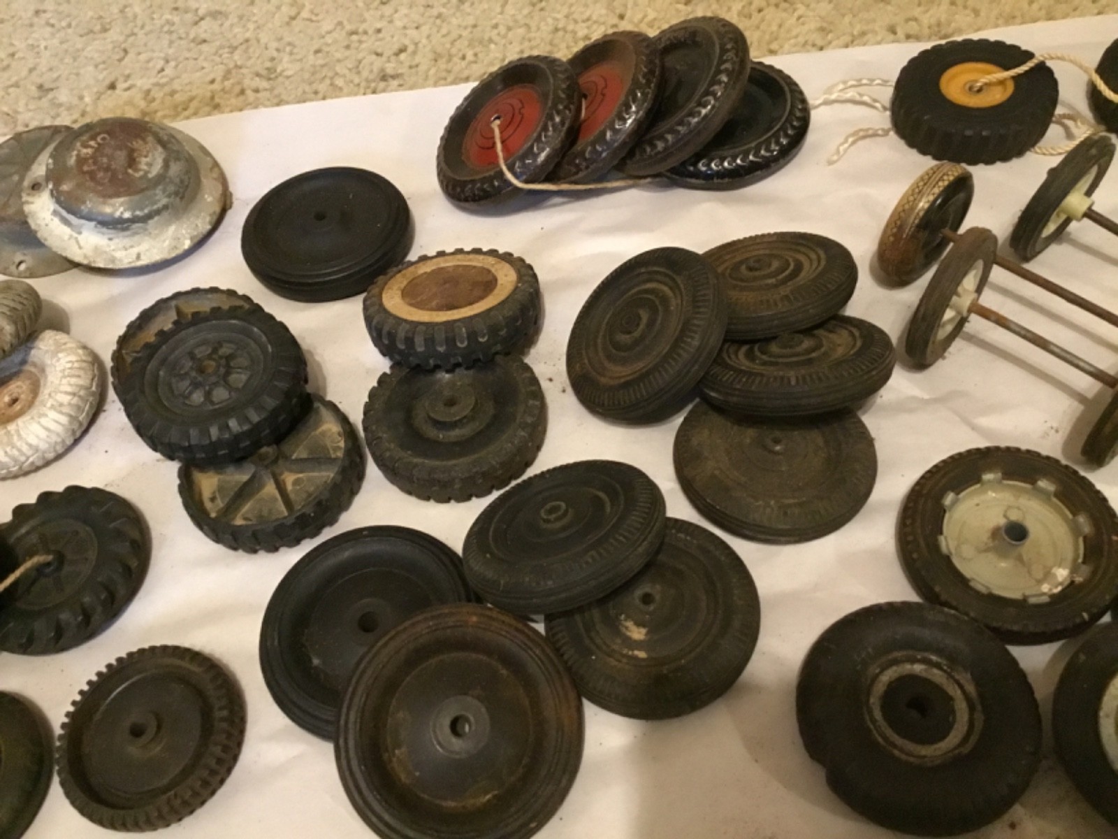 Lot of 40 Vintage Antique Toy Parts Multiple Kinds of Wheels, Metal, Rubber