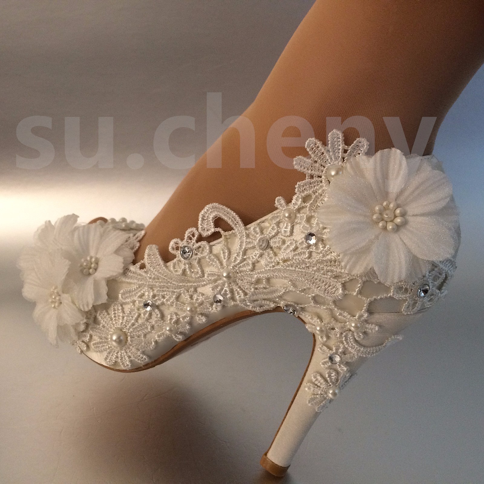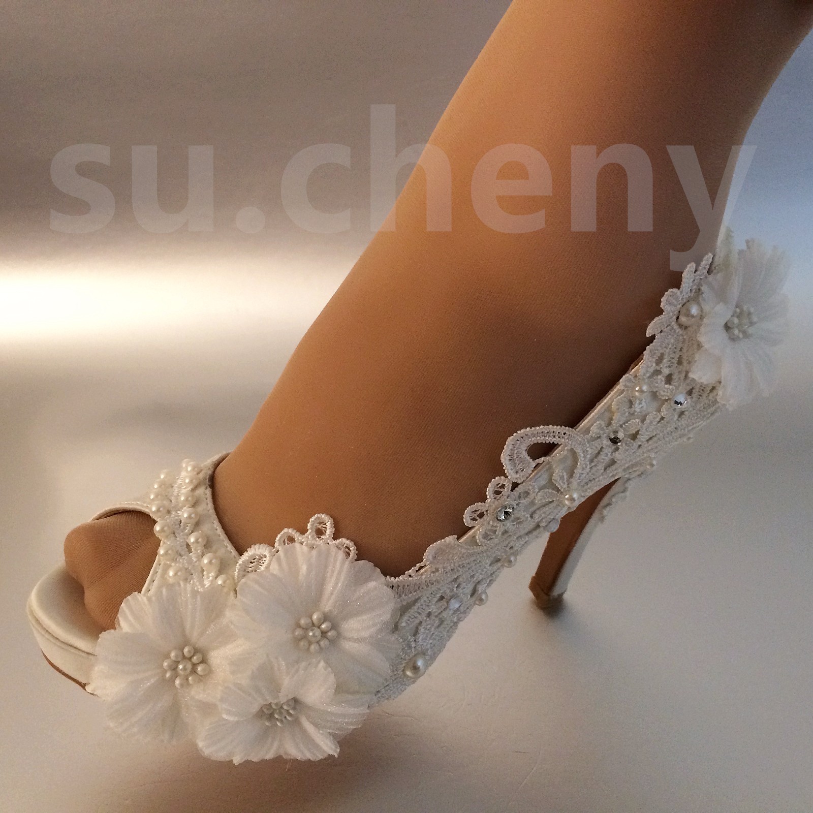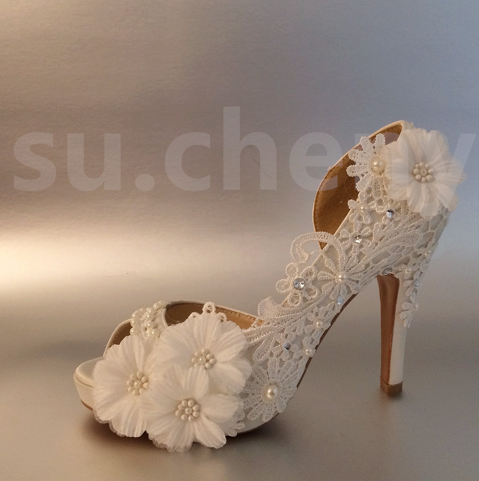 su.cheny 3 4 Lace white light ivory open toe sequin daisy Wedding Bridal shoes