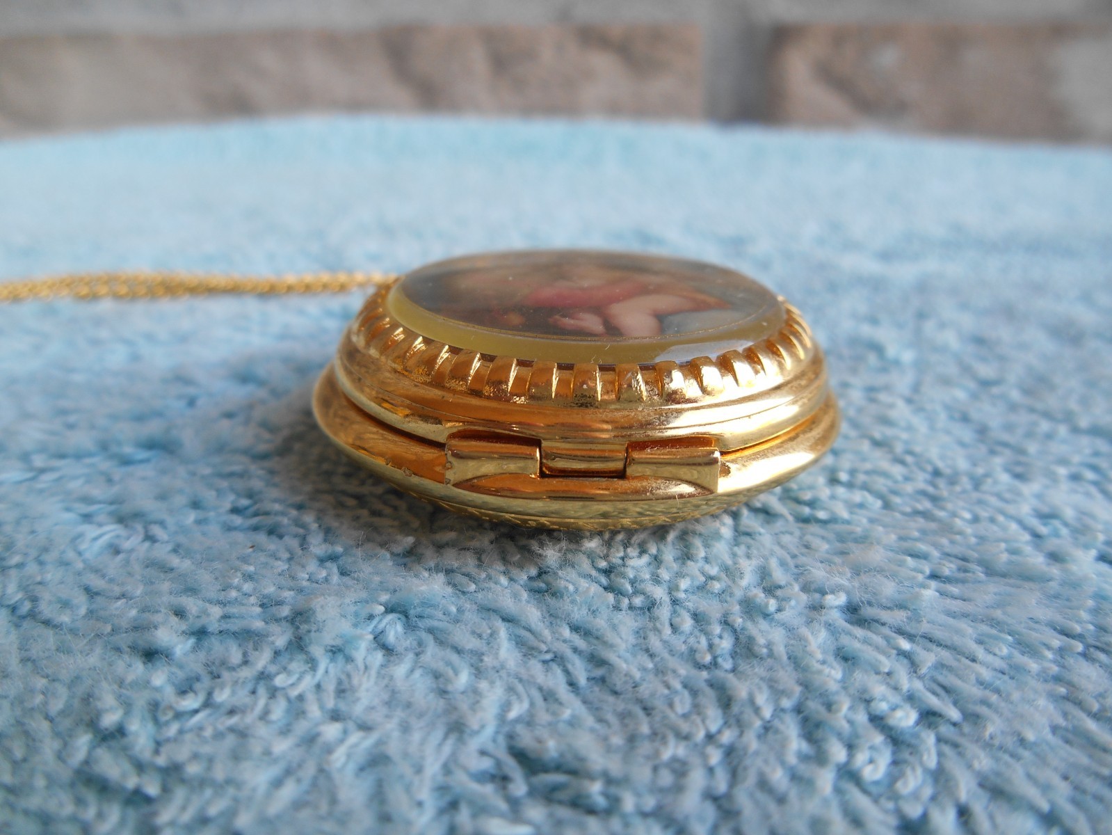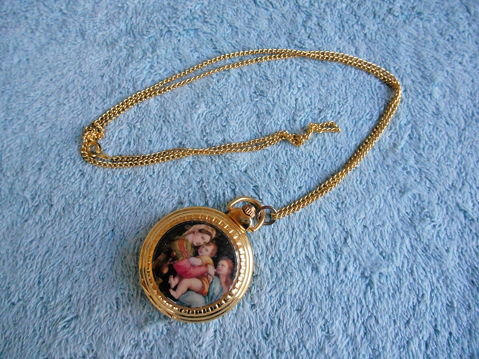 GOLD TONE 1-1/2 QUARTZ POCKET WATCH NECKLACE WITH ART. NEEDS NEW BATTERY
