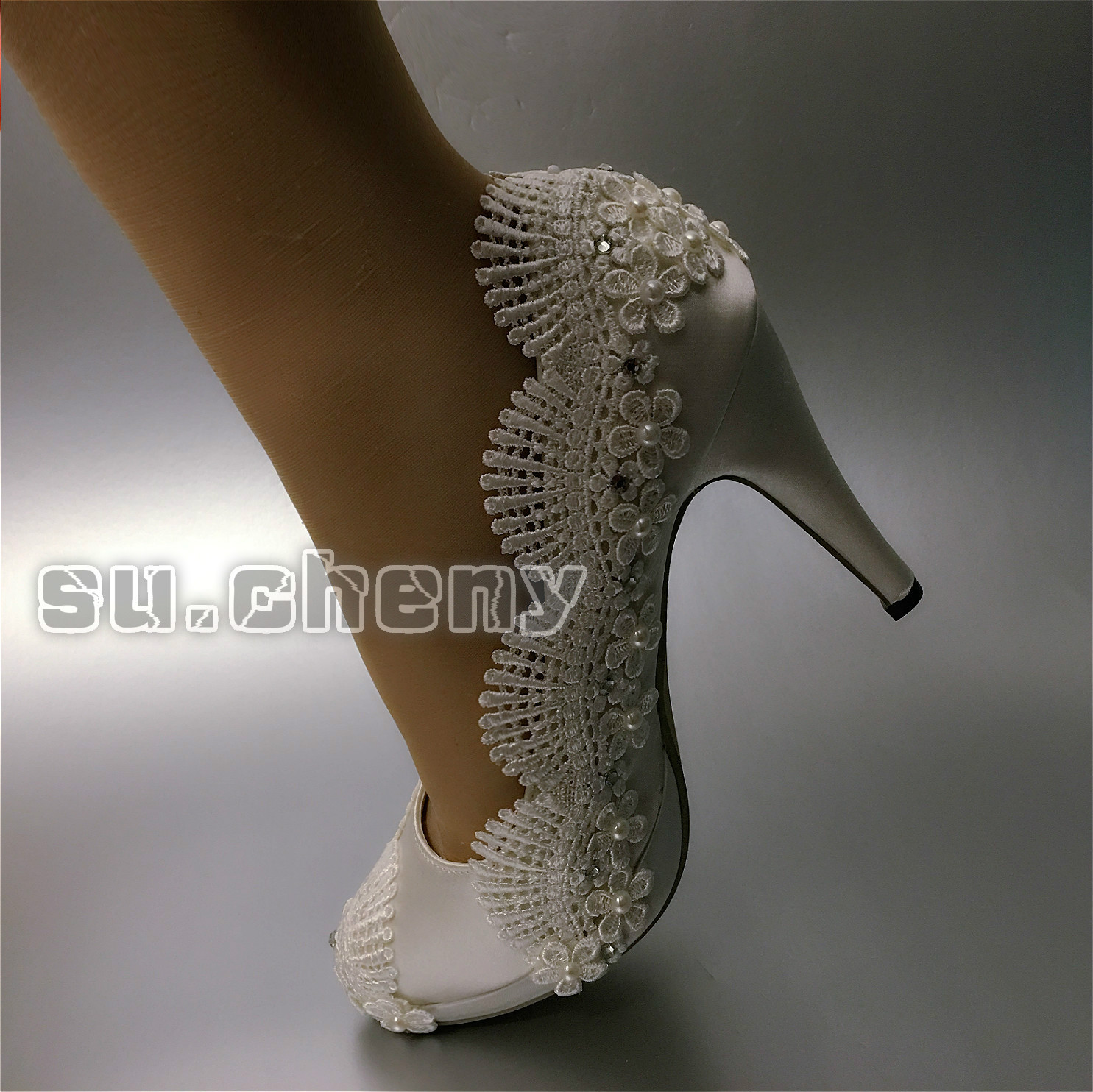 su.cheny CLOSE toe 3 4 heel satin flowers white ivory lace Wedding Bridal shoes