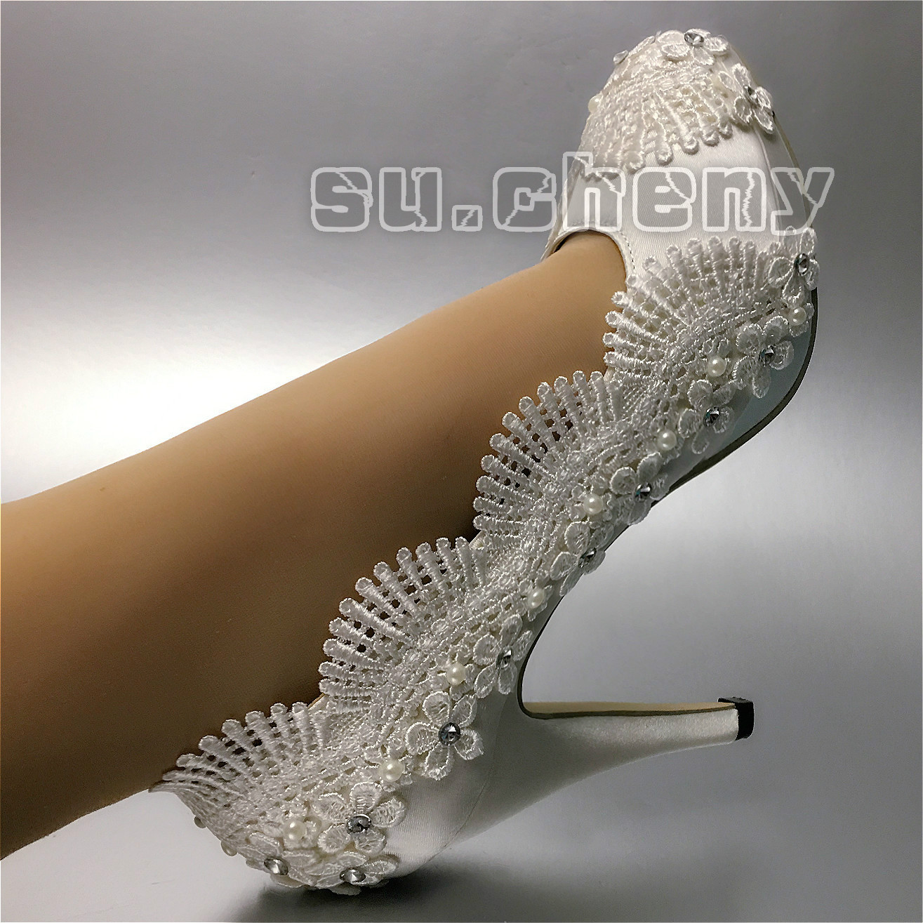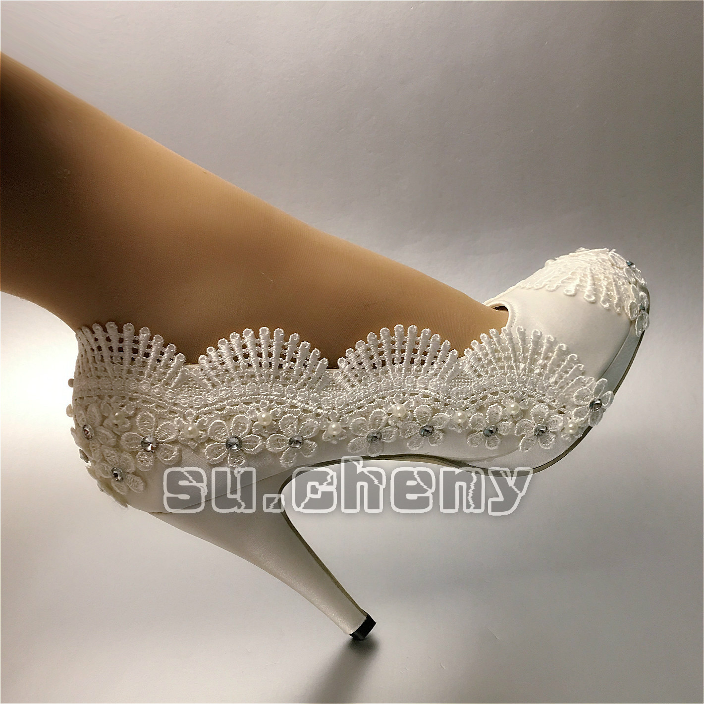 su.cheny CLOSE toe 3 4 heel satin flowers white ivory lace Wedding Bridal shoes