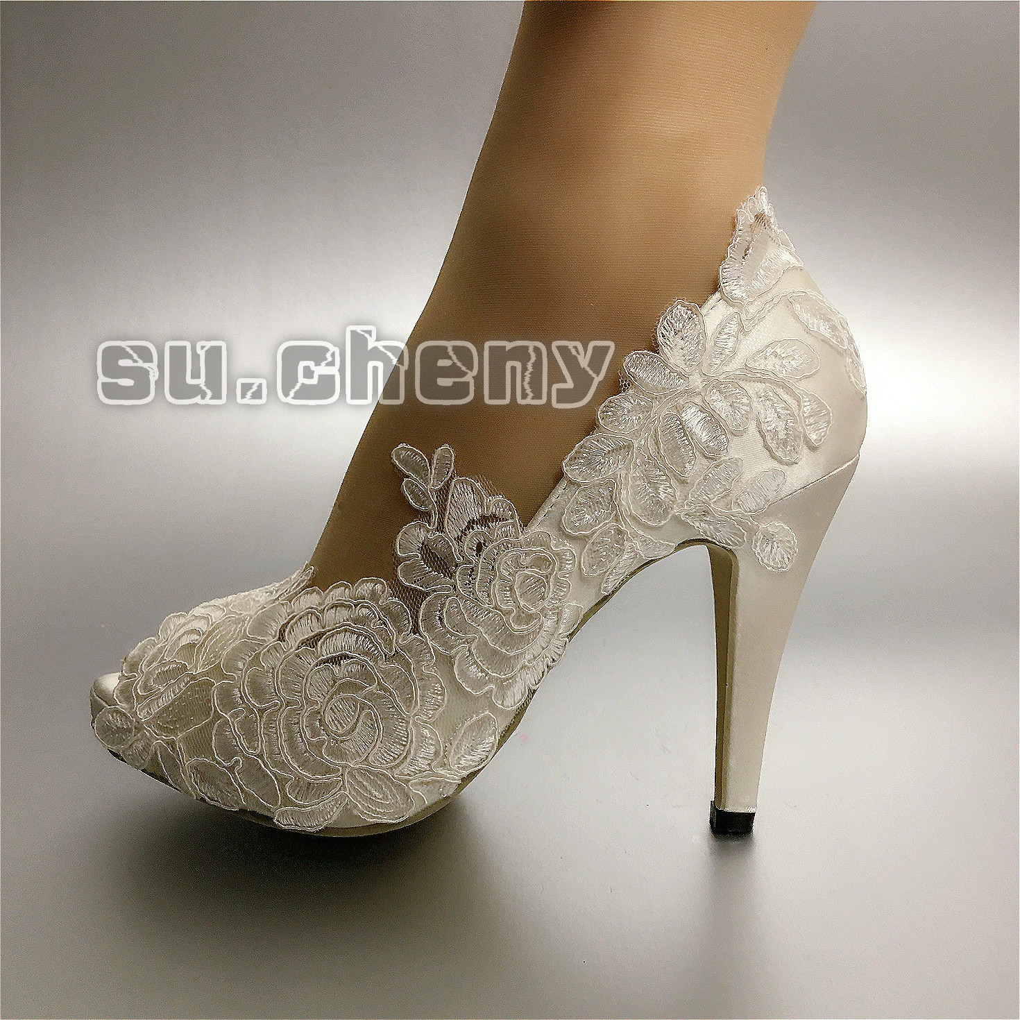 su.cheny 3 4 heels white ivory fine satin lace open toe Wedding Bridal shoes