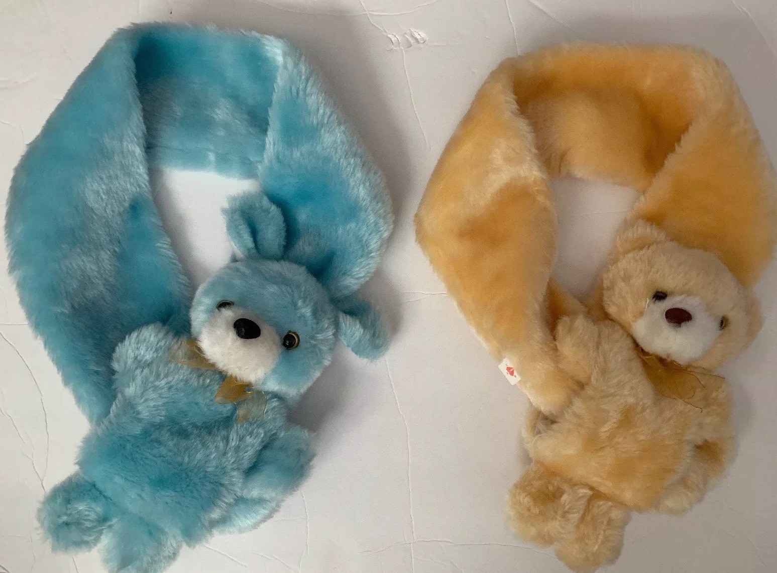 FAUX FUR BEAR KIDS SCARF UNISEX ONE SIZE KIDS LOT OF 2 BLUE BEIGE