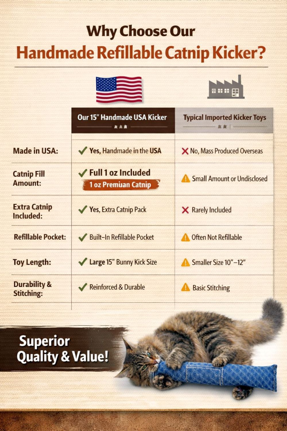 15 Refillable Catnip Kicker Toy for Cats and Kittens- Plush Kick Stick USA Made