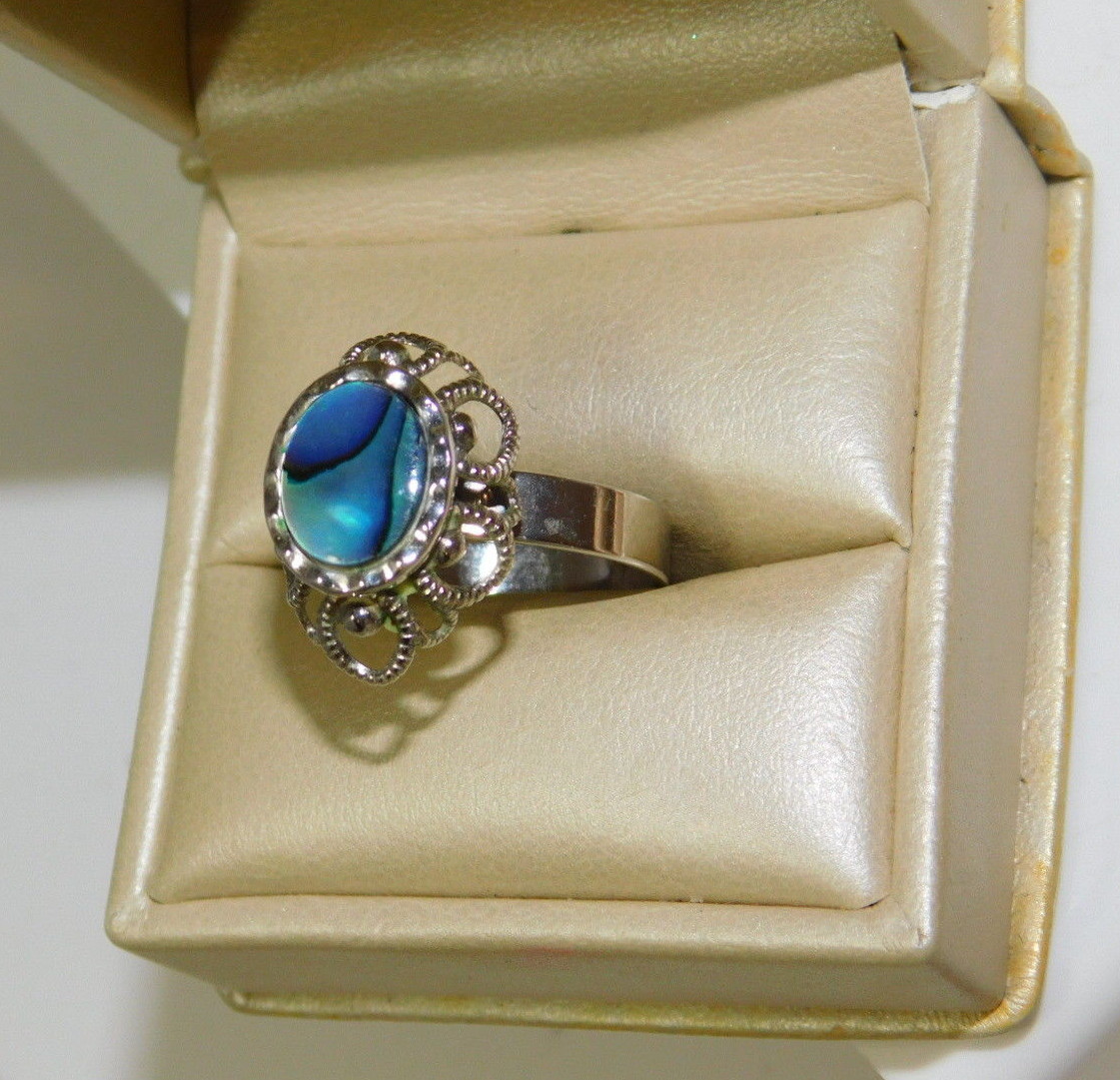 Blue Green Abalone Shell Silver tone Filigree Adjustable Ring 6k 13