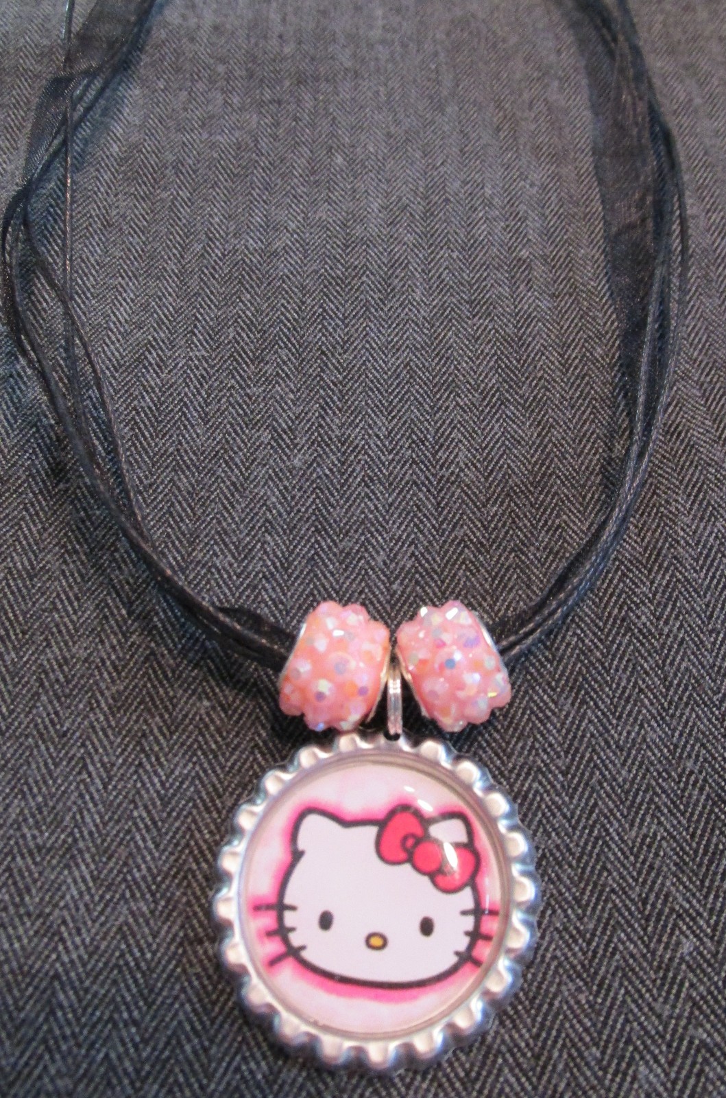 HELLO KITTY Cat Black Ribbon Bottle Cap Bling Charm Necklace Pink Beads Face Bow