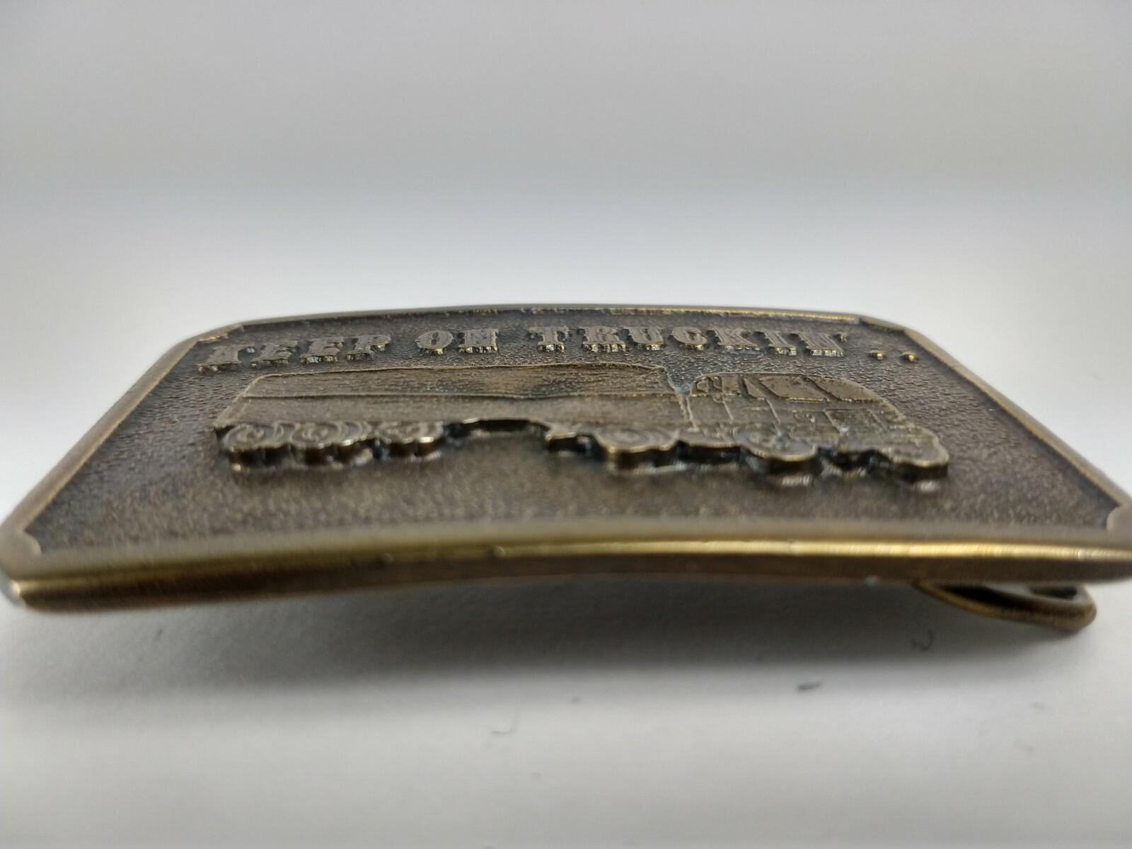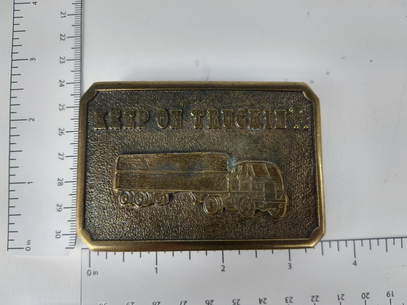 Vintage 1973 Keep On Trucking belt buckle James Lind Wyoming Studios Art Works